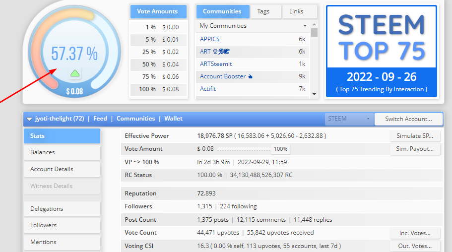 This meter will be at 100% if you haven't yet voted on Steemit. When you start voting, you should check steemworld.org frequently to monitor your influence. Your voting power is reduced by 2% each time you cast a full-strength upvote. The value you can add to another post reduces as your voting power increases.