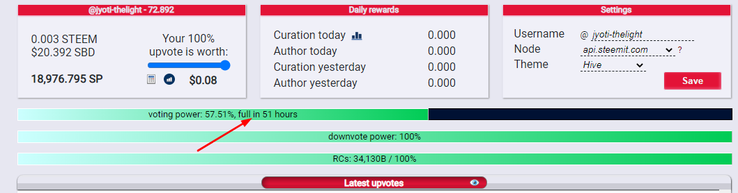 Your account has a voting power statistic that is current at all times. This value, which ranges from 0% to 100%, you can check your VP here just change your username in the address bar and it will show like this