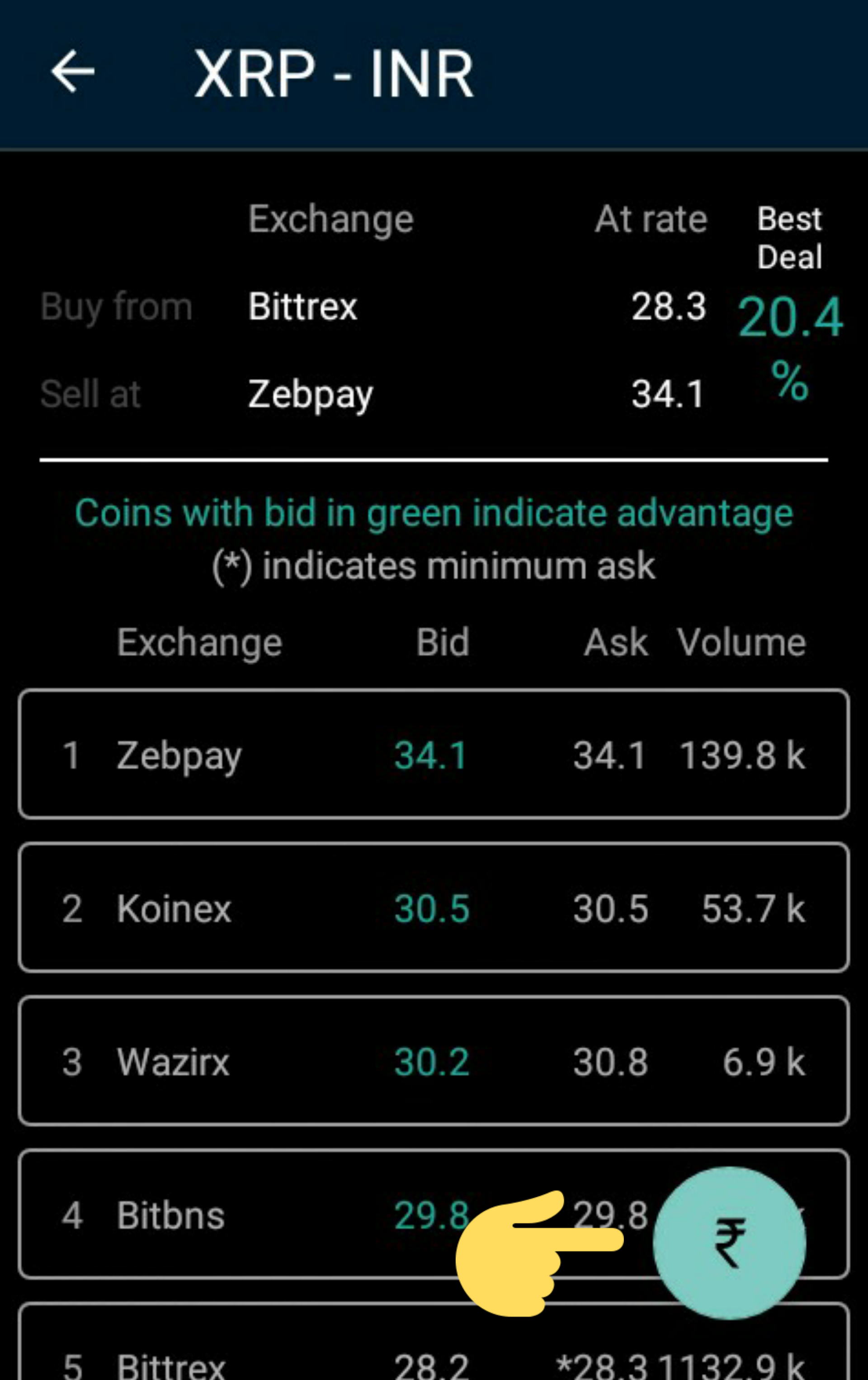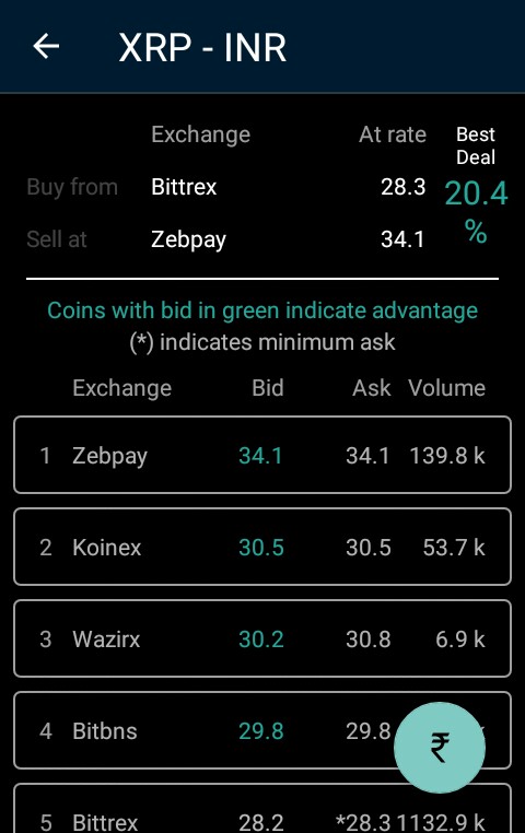 If you decide to click on any of the cryptocurrency, for our example here we have XRP. As you can see in the image above, you can see that bittrex is currently the cheapest one with the price of ₹28.3 and the highest price currently is at zebpay with ₹34.1.
