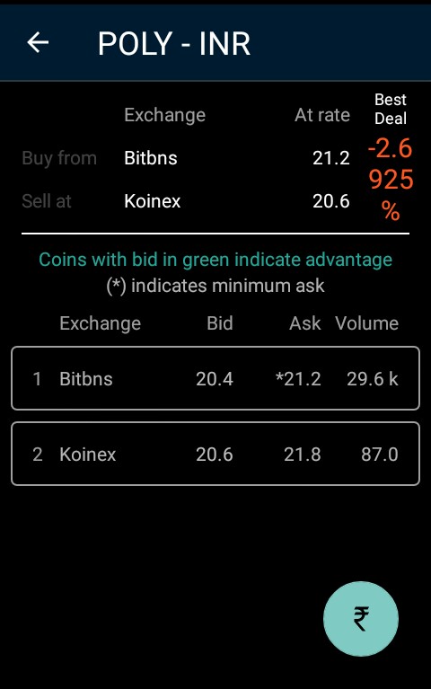 Note the you can check all of these and see and reverse arbitrage opportunities as well. In example we have polymath $POLY, which can be bought at ₹20.6 from koinex and sold at bitbns for ₹21.2, giving you 2.69%.