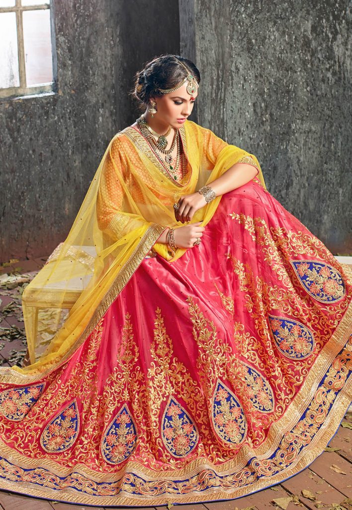 The Rajasthani traditional outfit is replete with bright contrasting colors and heavy handwork embroideries. Red being the most favored color of many Indian brides, they also go for colors like orange, bright yellow and appealing pink color costumes. There are many pieces of jewelry worn by the Rajasthan brides to adorn various body parts. Rakhri is the bridal jewelry for the forehead, Timaniyaan is a choker studded with diamonds, Chooda is actually a set of gold and ivory bangles, Bajuband is an armlet bedecked with gold and stones, Bichhiya is toe-ring for feet and Nath is the nose ring made of stones.