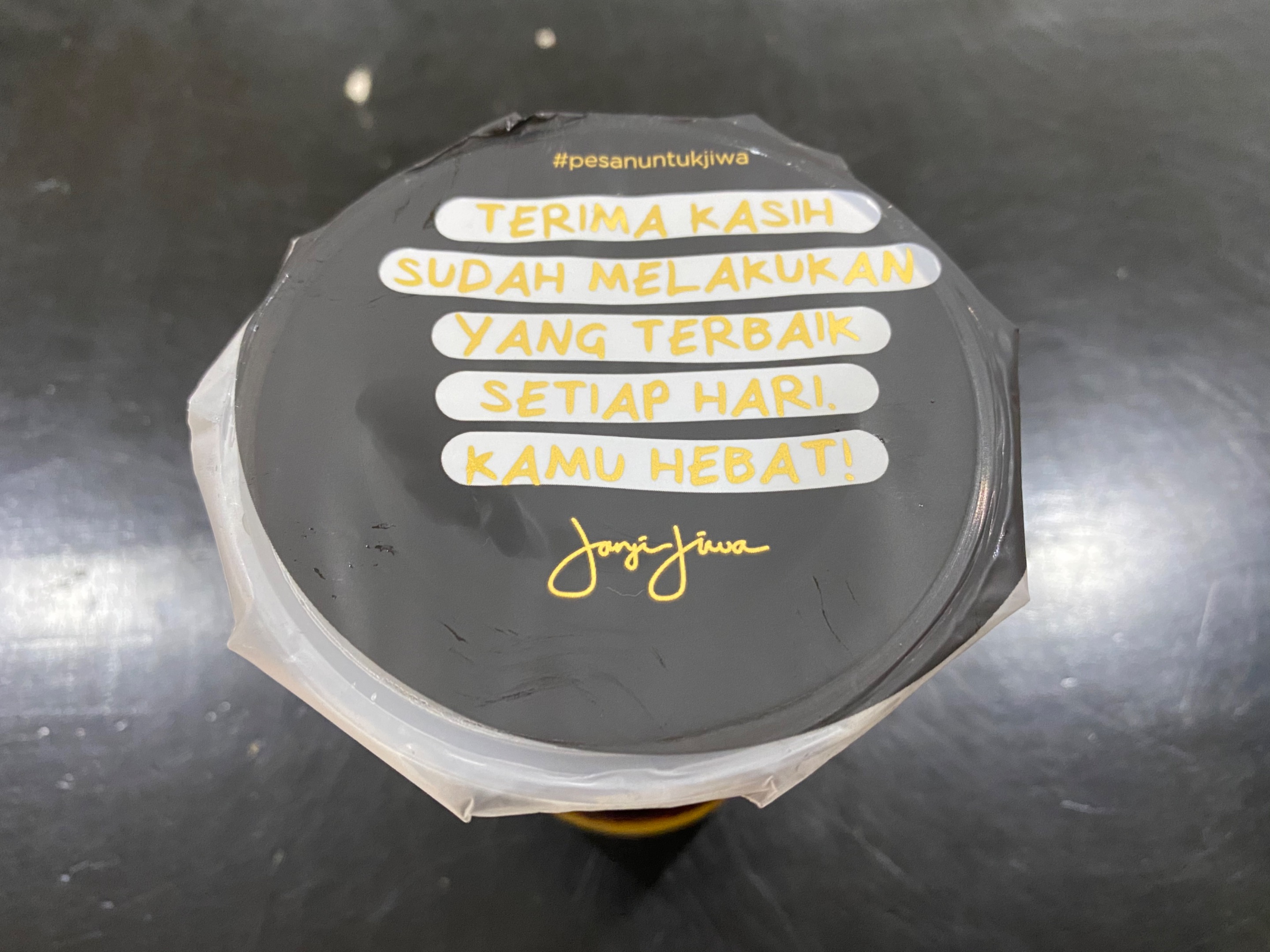 Kemasan dari Kopi “JANJI JIWA” memang menarik. Ada quotes yang “anak muda sekali” dan memang sesuai dengan target pasar yang ada.