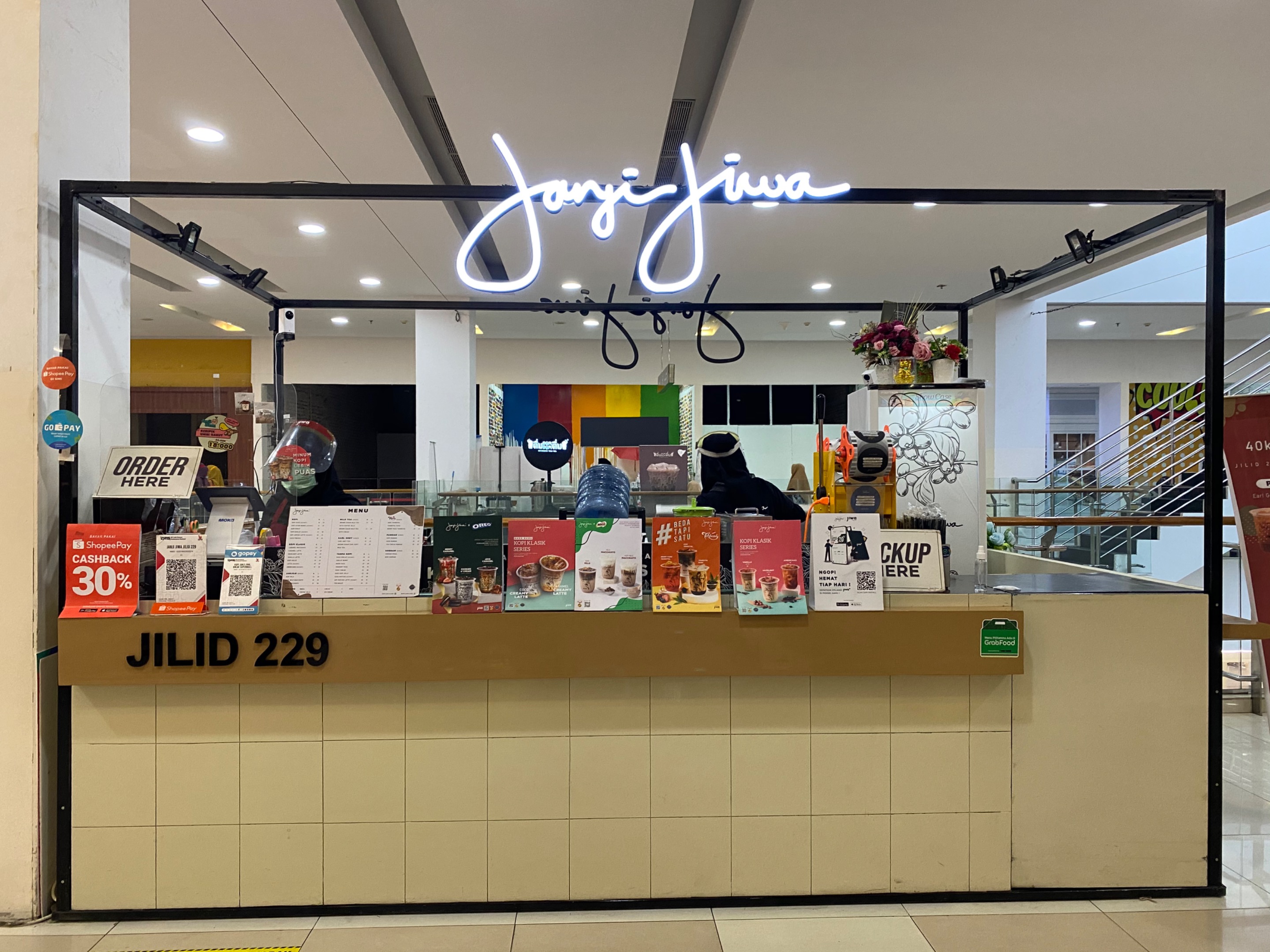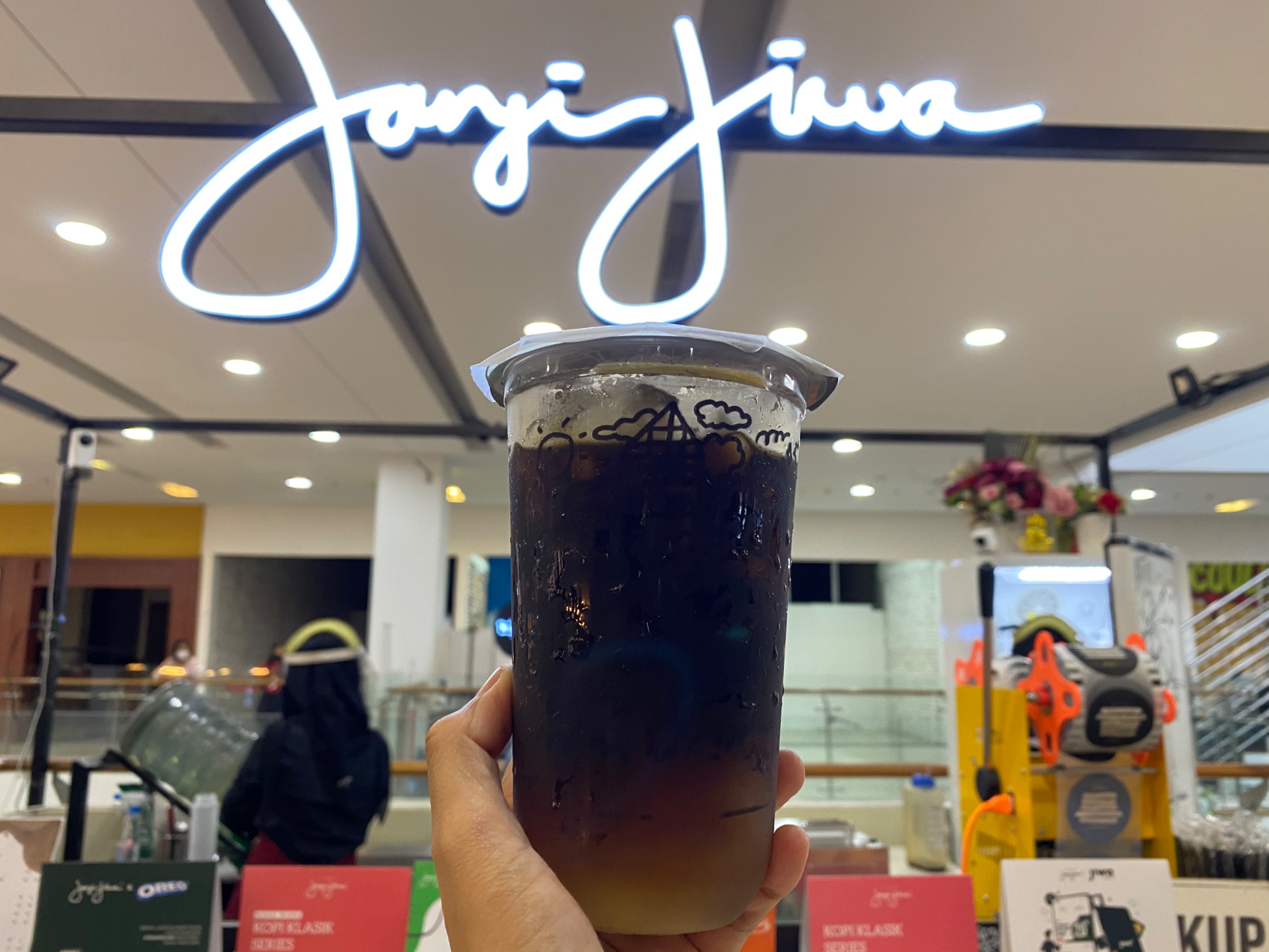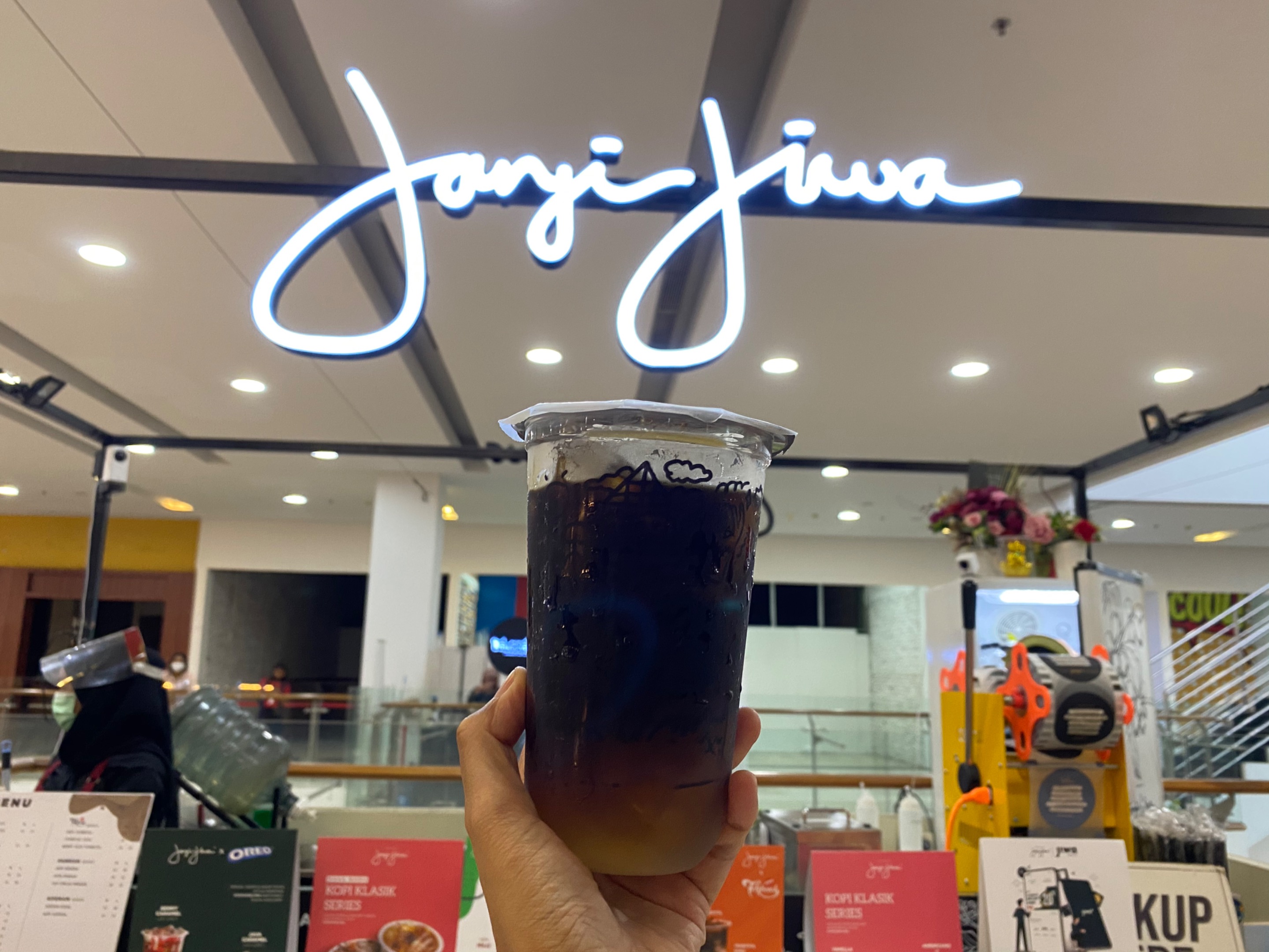 Tersedia banyak menu-menu yang menarik pada outlet ini. Kopi “JANJI JIWA” juga banyak bekerjasama dengan brand lainnya Oreo dan Teh Botol Sosro.