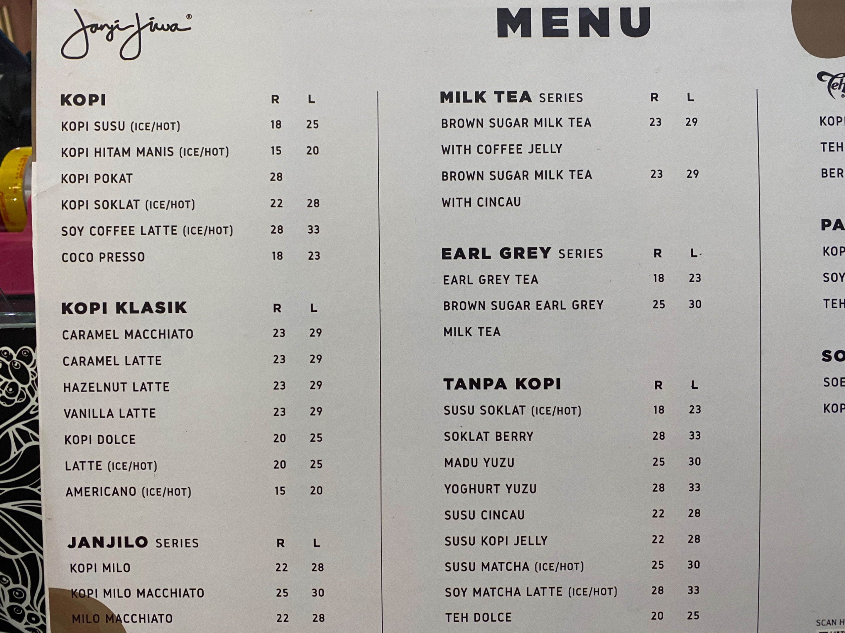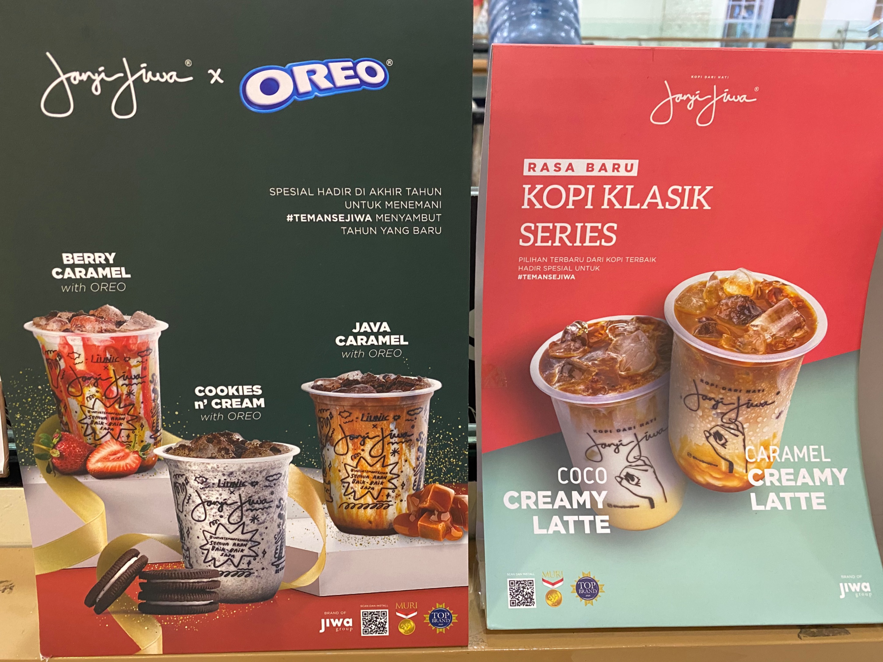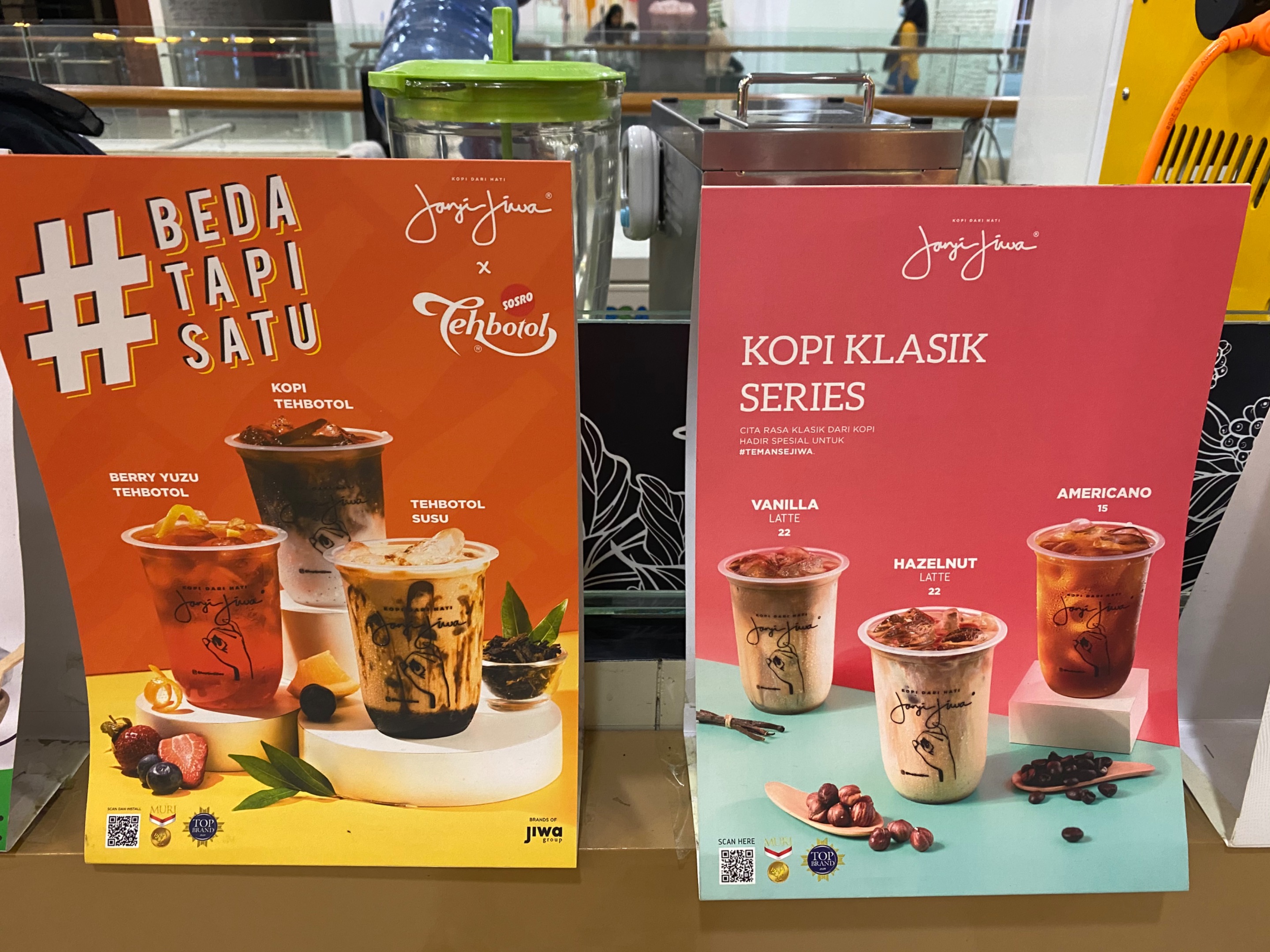 Tersedia banyak menu-menu yang menarik pada outlet ini. Kopi “JANJI JIWA” juga banyak bekerjasama dengan brand lainnya Oreo dan Teh Botol Sosro.