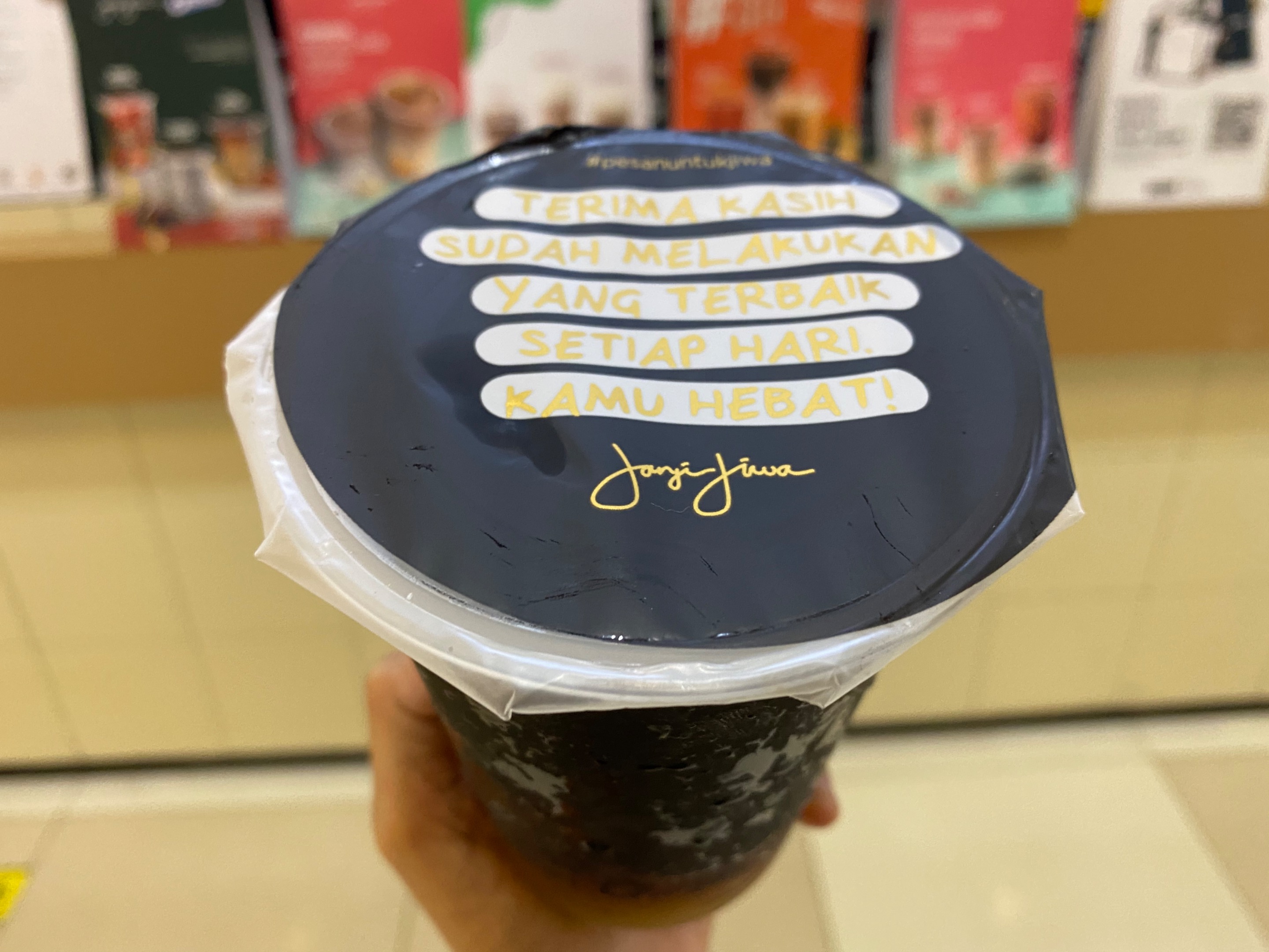 Brand kopi lokal ini memiliki tagline kopi dari hati. Bisa dibilang Kopi “JANJI JIWA” bisa menjadi alternatif lain selain brand internasional seperti Starbucks.