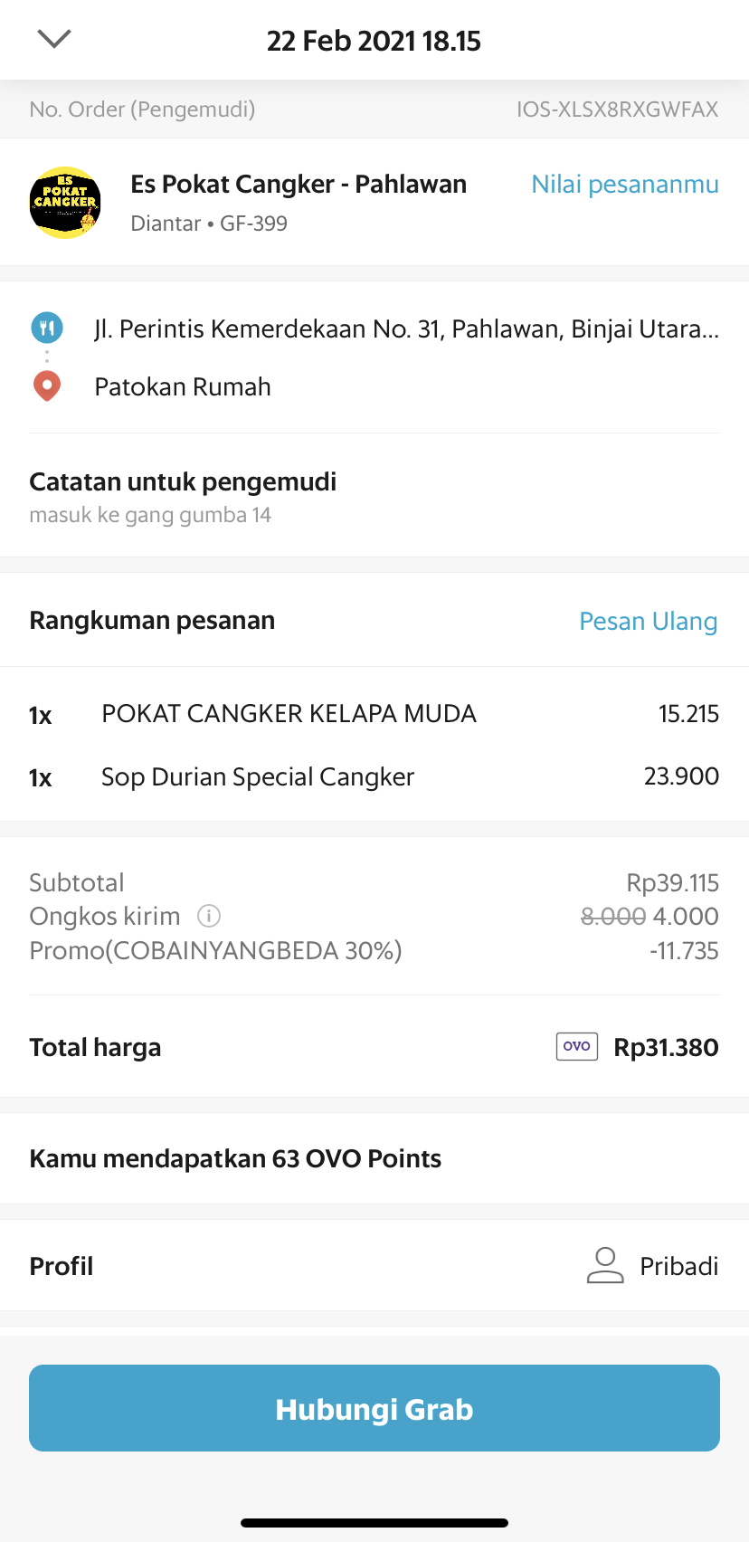 Jadi memang saya terbiasa memesan makanan ataupun makanan dan minuman yang sedang saya inginkan, di Grabfood. (Ini bukan promosi, ya, karena emang saya sudah menggunakan layan Grab dan Grab Food sejak lama).