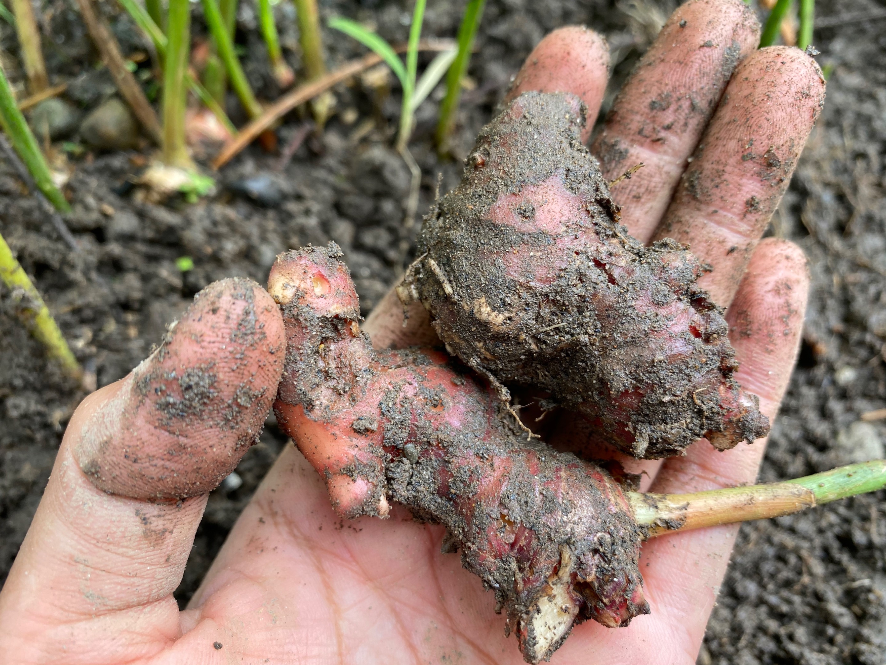 Jahe merah yang baru saja dipanen. Hanya butuh sekitar satu ibu jari untuk menghasilkan beberapa gelas minuman yang hangat.