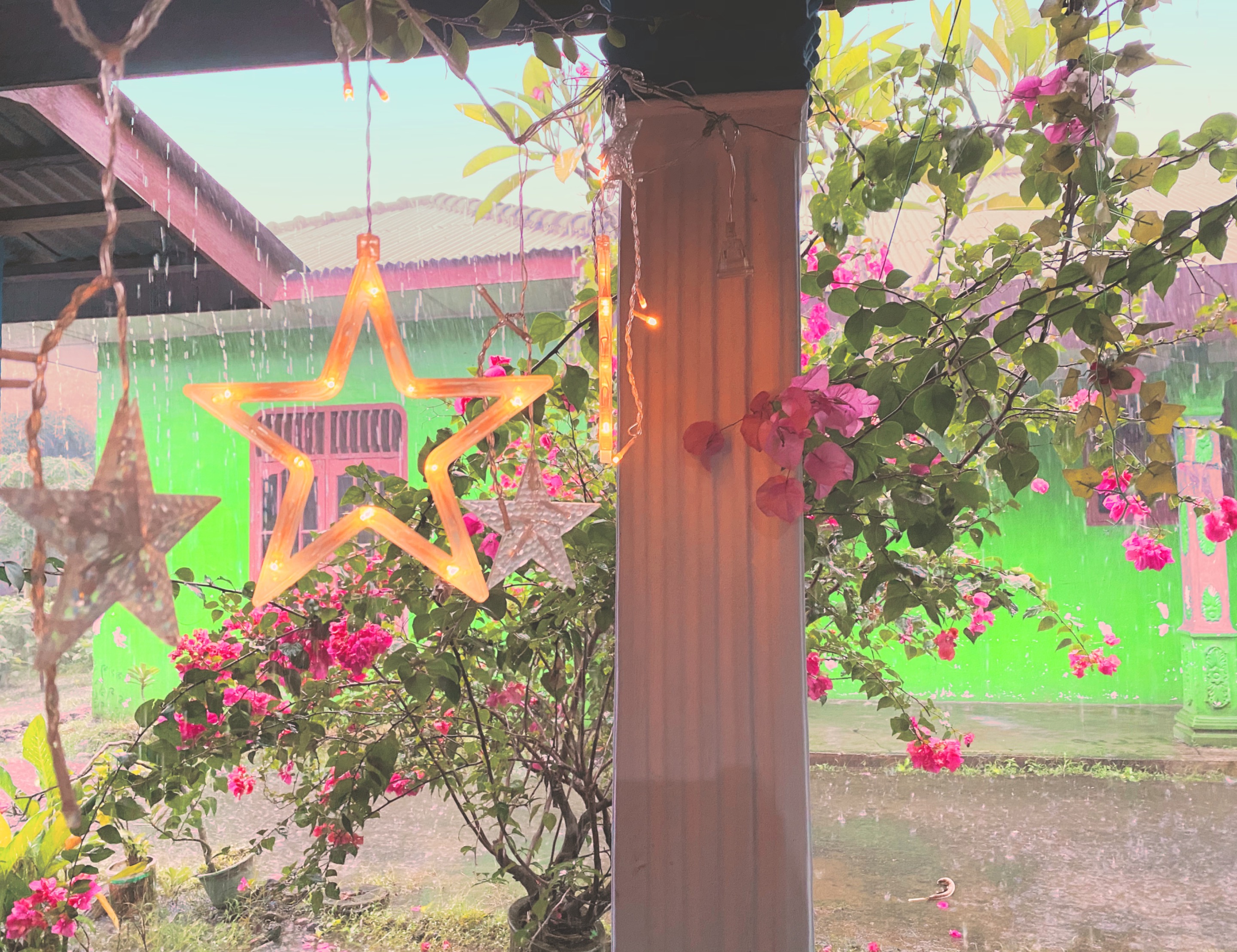 Membuka pintu dan menikmati hujan dari teras rumah saya. Karena hari terasa gelap dengan hadirnya hujan, lampu-lampu hiasan yang biasanya saya hidupku untuk malam hari, sekarang tetap saya hidupkan.