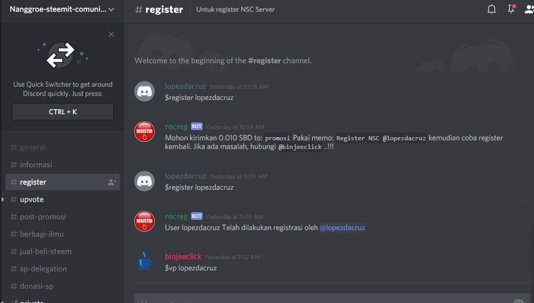 Chanel Regestrasi di chanel ini yang paling penting, ketika masuk ke grup discord teman-teman langsung dirahakan ke Regestrasi, untuk menajdi member dan menerima upvote automatis harus mengrimkan 0.010 SBD ke akun @promosi, dan sistem kami akan mengarahkannya. Klik disini atau https://discord.gg/7cgkwtS