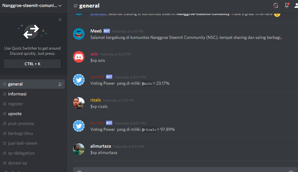 Begitu juga dengan sahabat Newbie di steemit, mereka sangat membutukan pertolongan sang master yang sudah kuat Steem Power, beranjak dari masalah diatas Team Nanggroe Steemit Community (NSC) dan membuat grup discord untuk menerima Upvote secara Automatis sesama steemians.