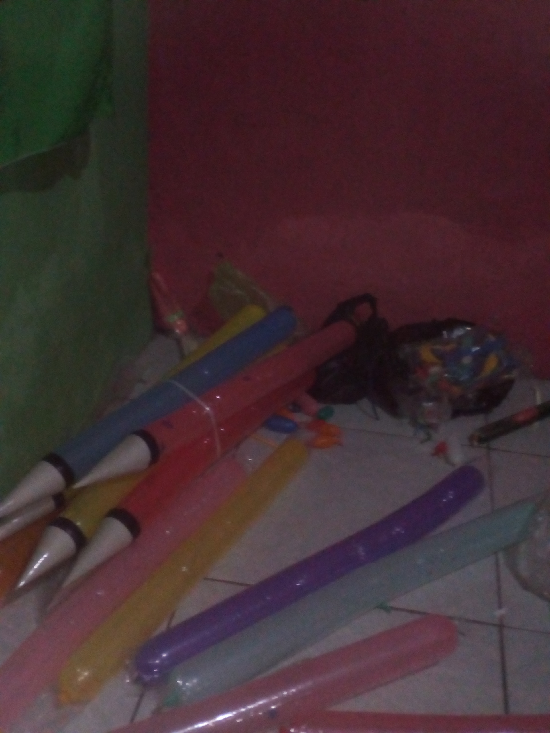 Memang banyak macamnya mainan anak dari balon. Tapi kami hanya bikin mainan ini dengan bentuk pensil dan semacam balon di dalam plastik dengan di idi air sabun dan pewarna makanan.