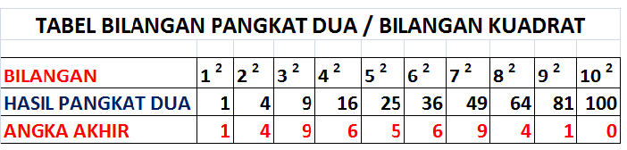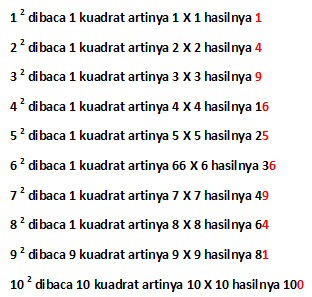 Jadi pangkat dua atau bilangan kuadrat adalah mengalikan bilangan itu sendiri sebanyak dua kali. Perhatikan beberapa contoh bilangan pangkat dua di bawah ini :
