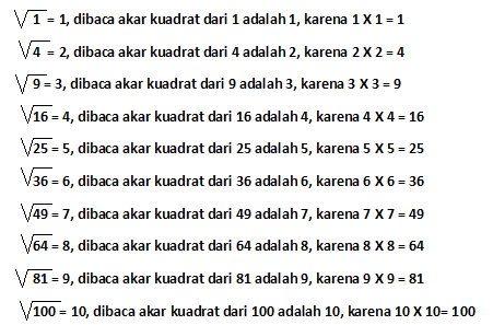 karena 9 pangkat 2 adalah 81, maka akar kuadrat dari 81 adalah 9. Perhatikan akar kkuadrat berikut ini !