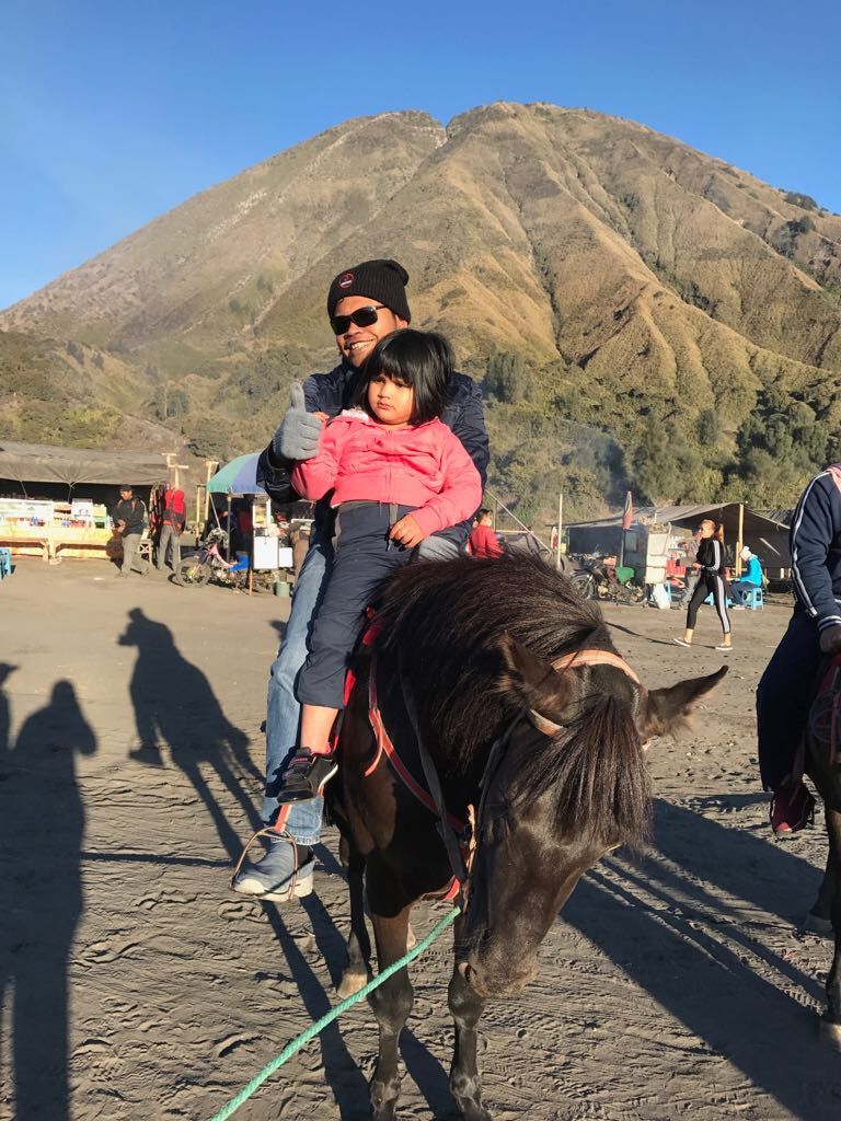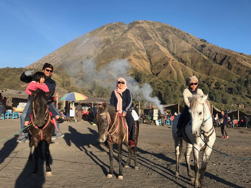 Kami menyewa tiga kuda. Mereka membawa kami menuju kaki kawah Bromo. Tapi sayangnya, kami tidak menaiki anak tangga untuk menjenguk dasarnya kawah.