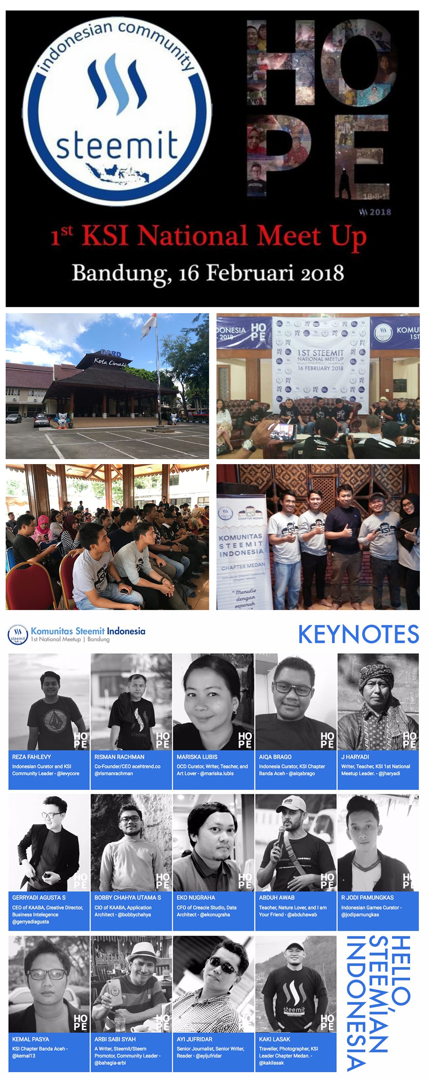 Seeing and feeling the atmosphere of 1st KSI National Event in Bandung that has passed certainly leave happiness and bring hope. Our hope together, so that this kinship can be well established, especially among steemians at KSI chapter Medan, and generally among steemians wherever located. Hopefully we can spread positive energy in working through this Steemit platform. Thank to the organizers of the first meetup event of the National KSI in Bandung, the curators of Indonesia brother @levycore and @aiqabrago, and all the steemians who have dedicated their work in Steemit. Together we can. Greetings from Medan, Horas.