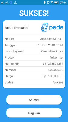 Bukti Pembayaran Pulsa Gratis 200ribu dari Aplikasi Pede Android