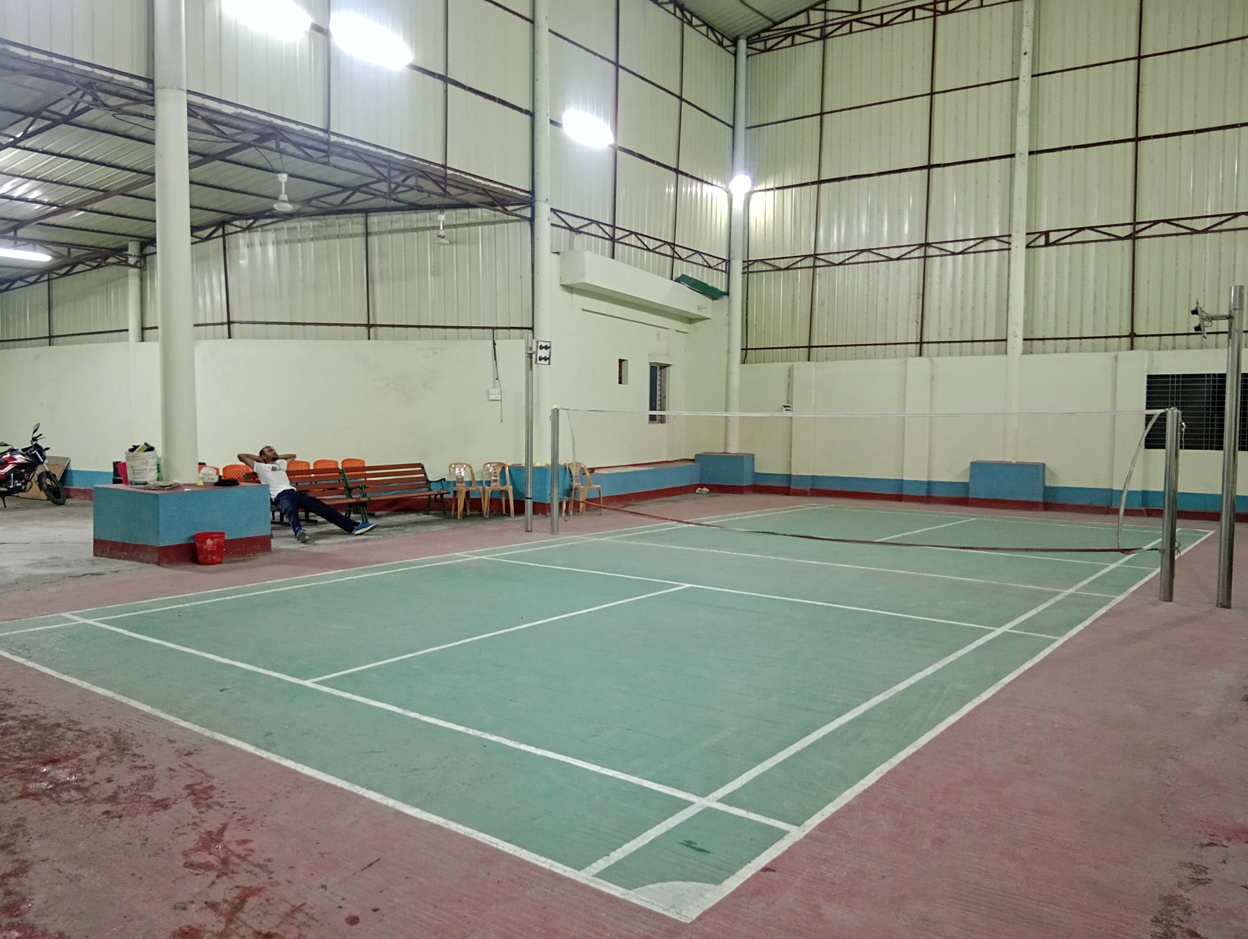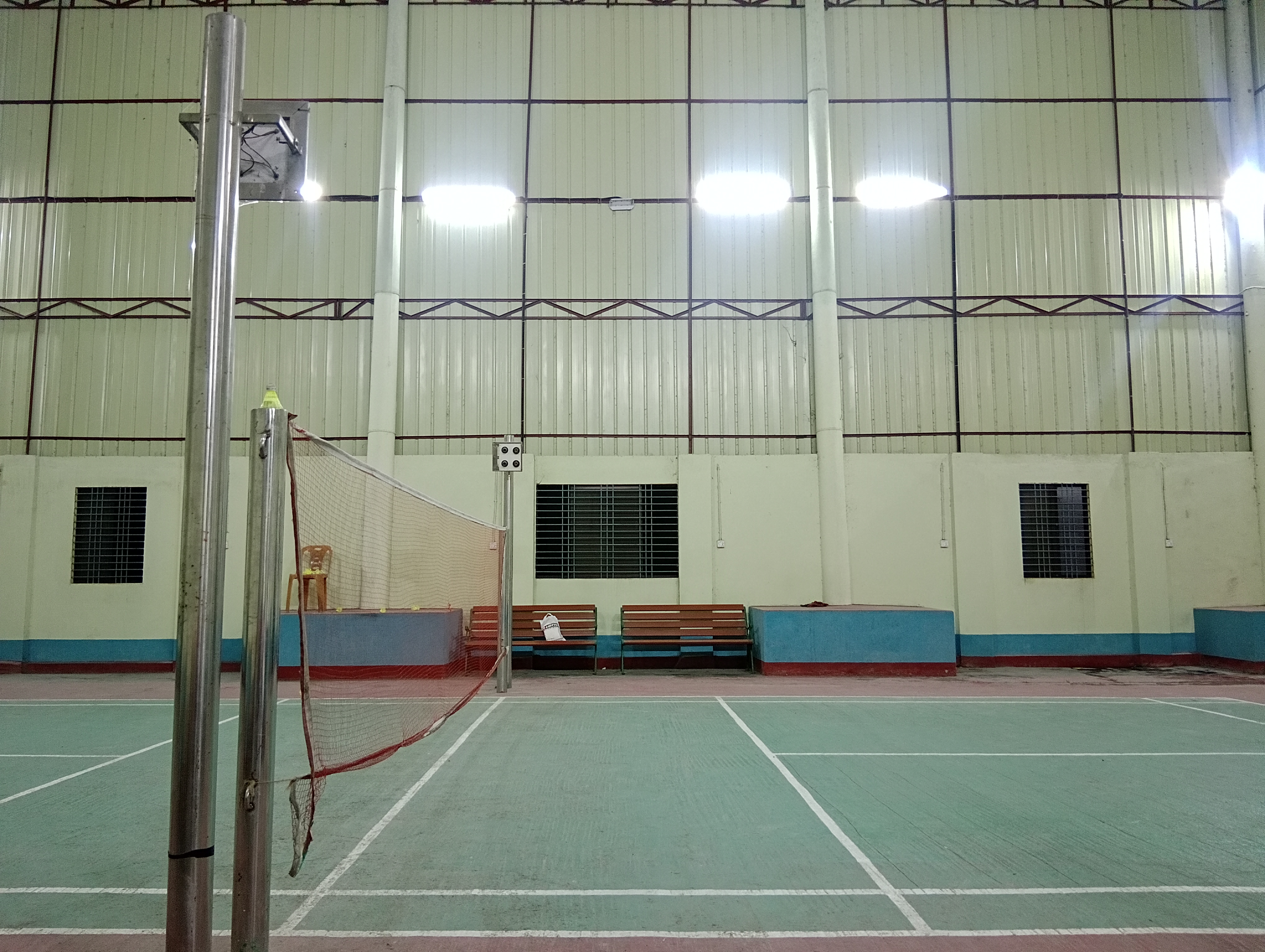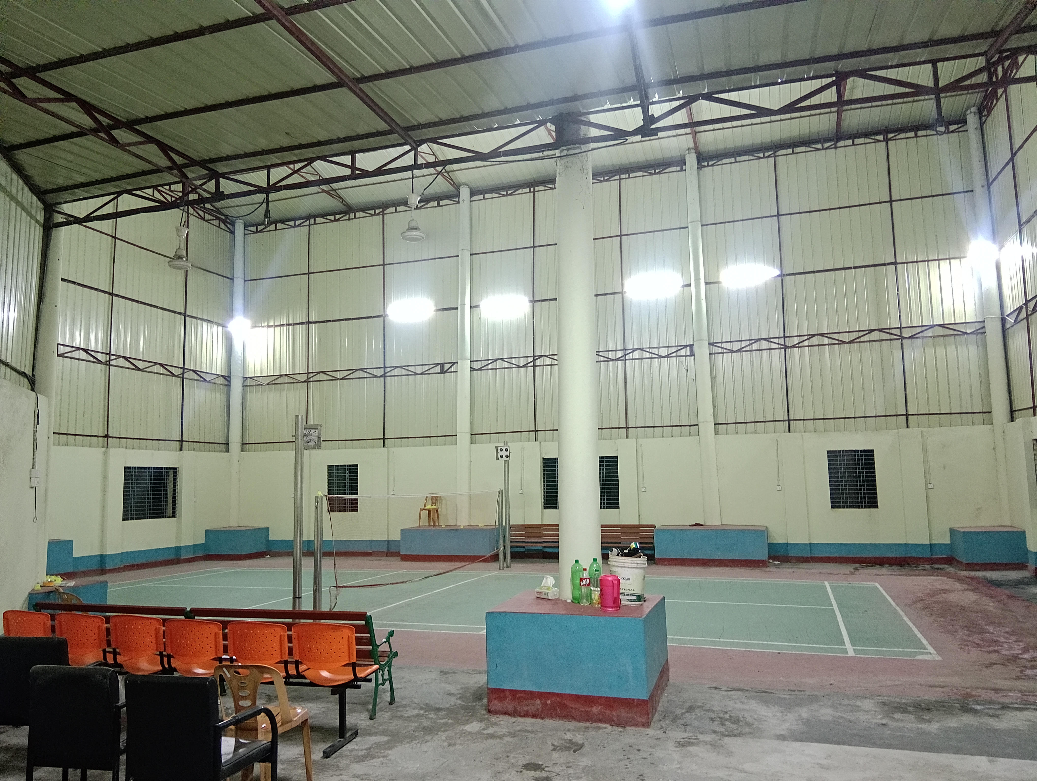 It is a four cornered building. The building is constructed from the ground up with brick walls ranging in height from around 10 to 12 feet, followed by tin structures. Actually, this sports center was designed specifically for badminton, so the building is quite tall.