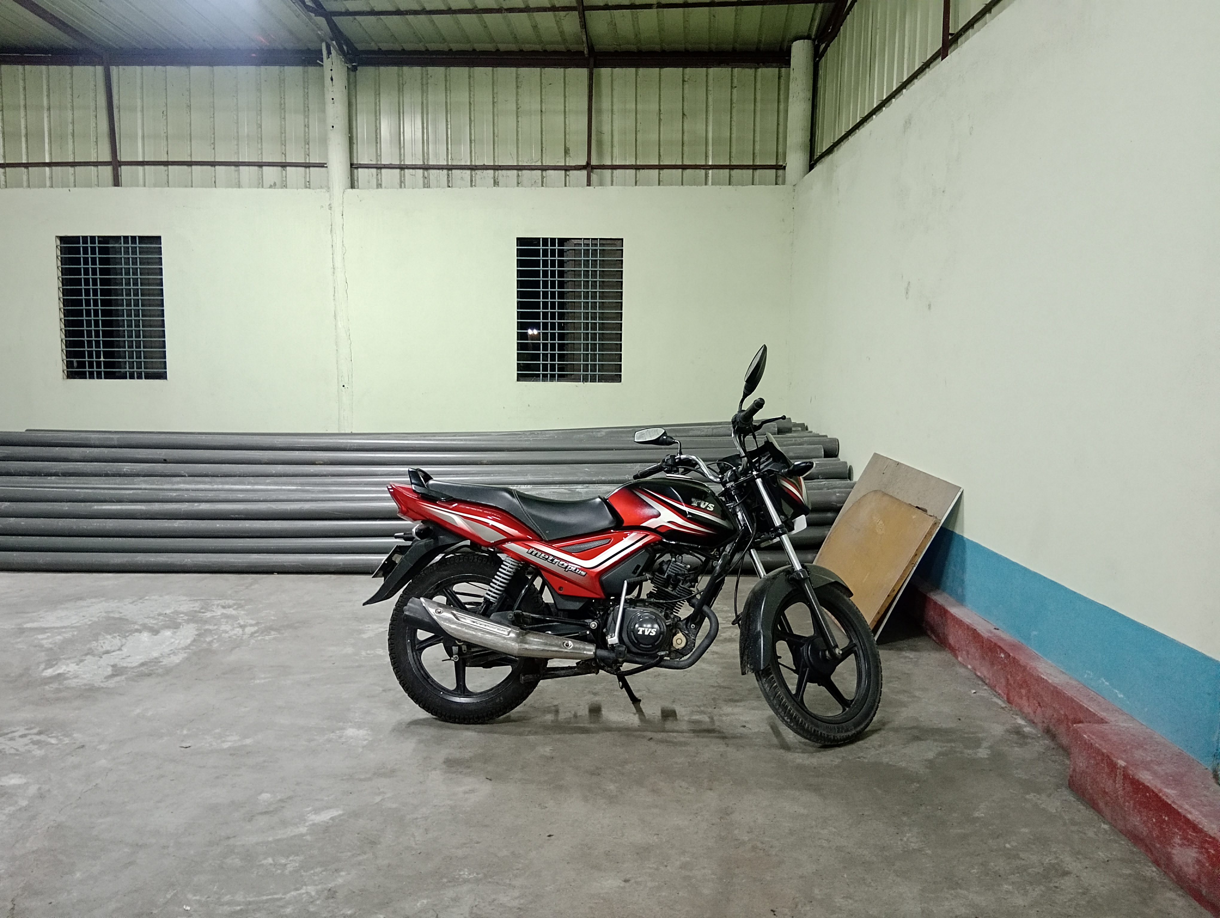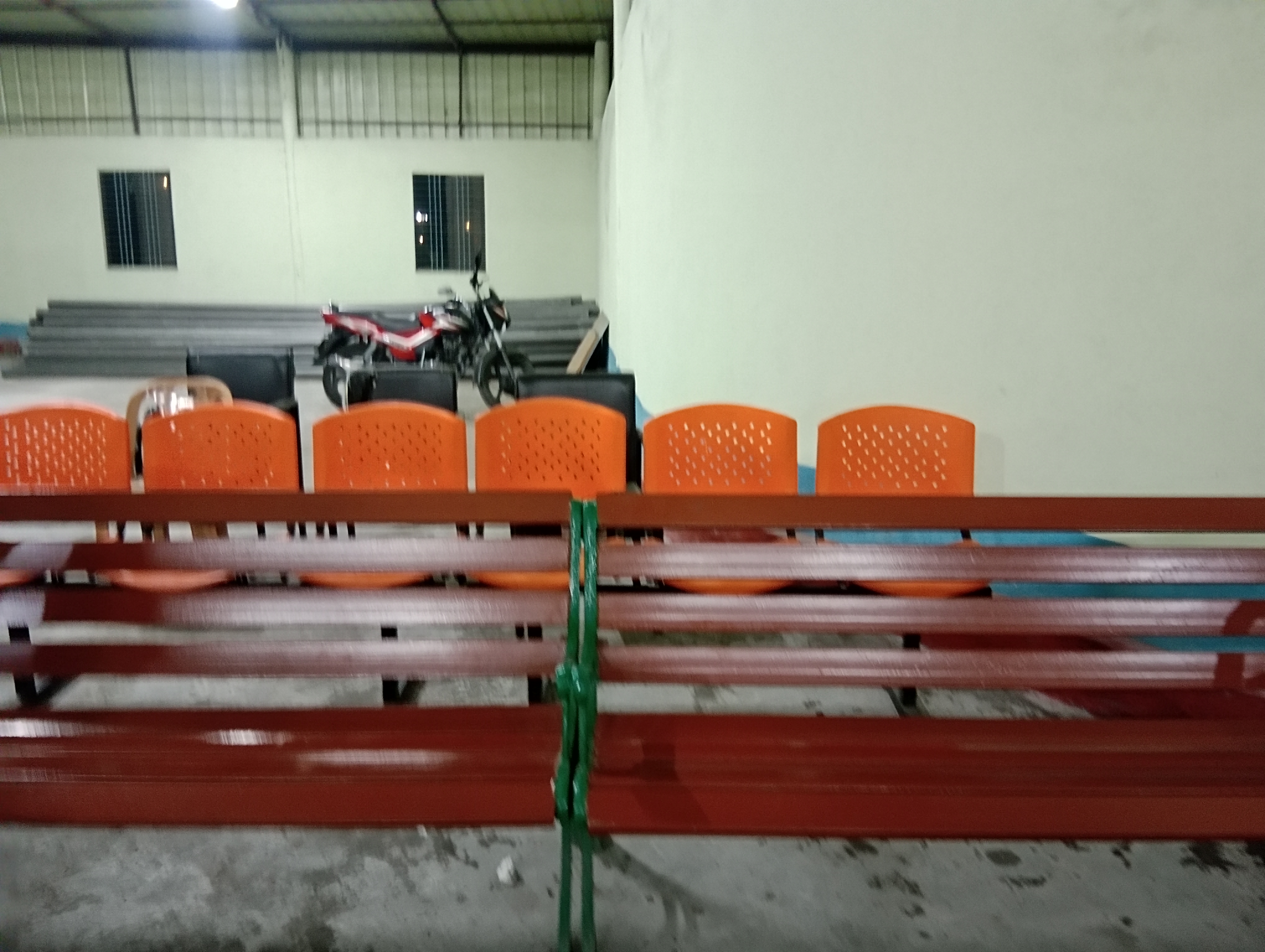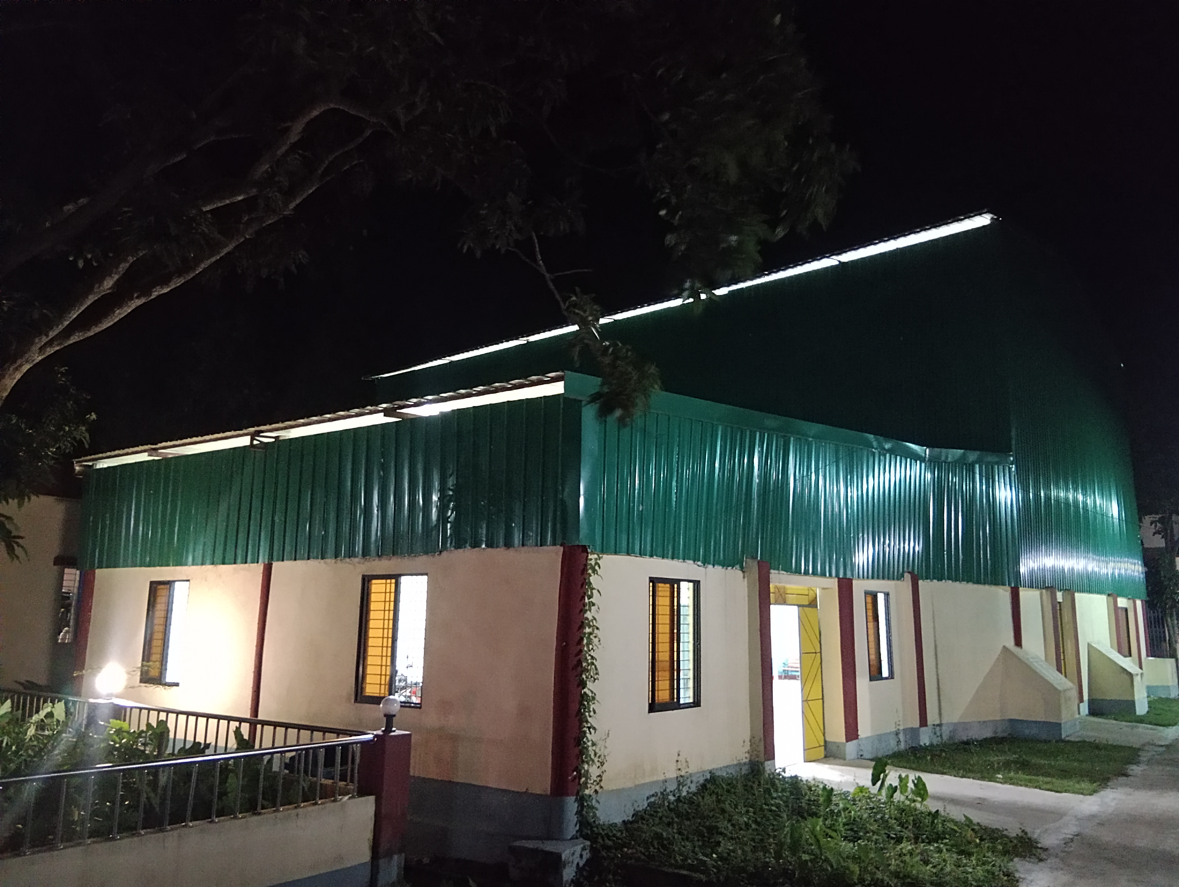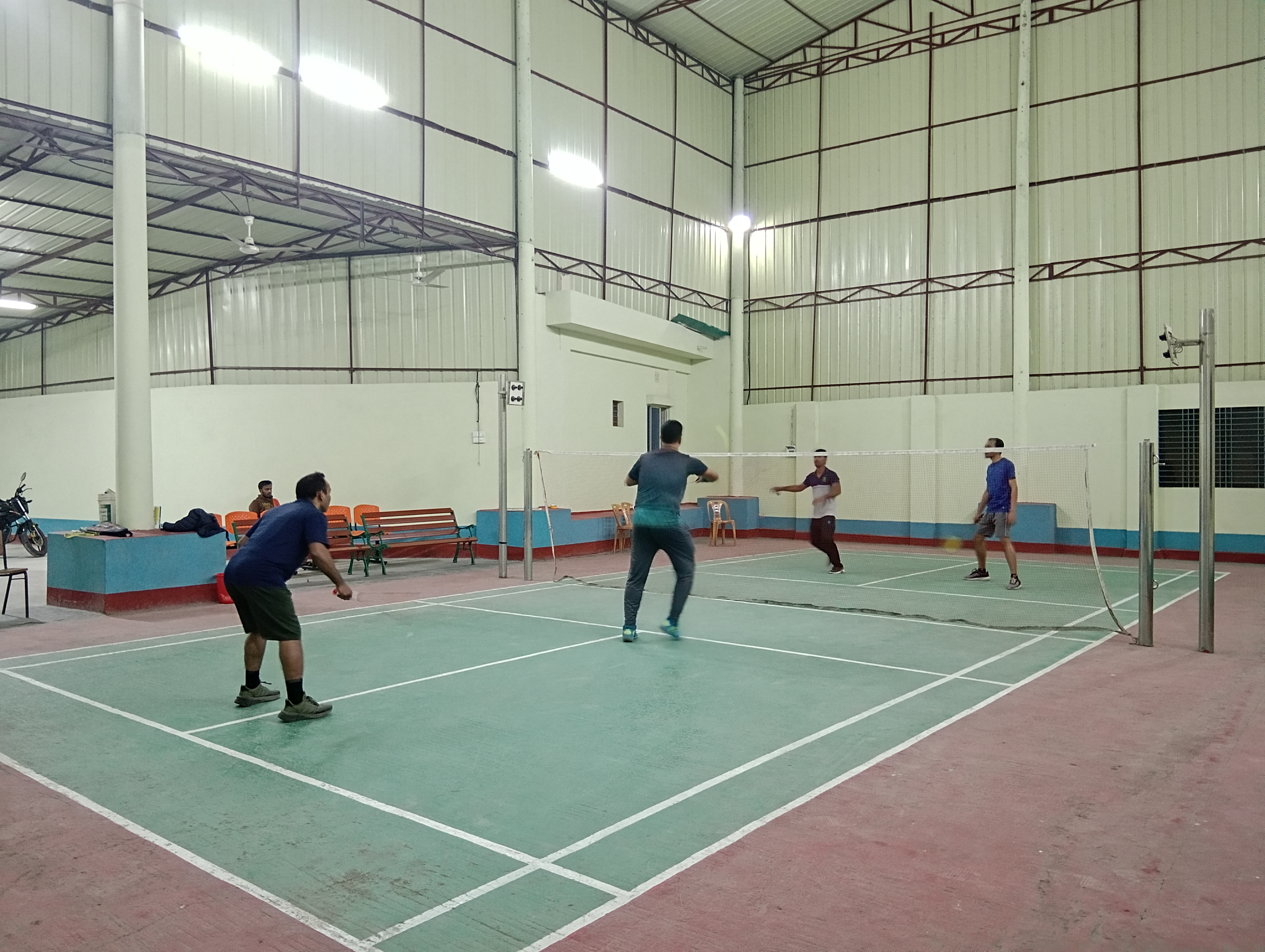 It is a four cornered building. The building is constructed from the ground up with brick walls ranging in height from around 10 to 12 feet, followed by tin structures. Actually, this sports center was designed specifically for badminton, so the building is quite tall.
