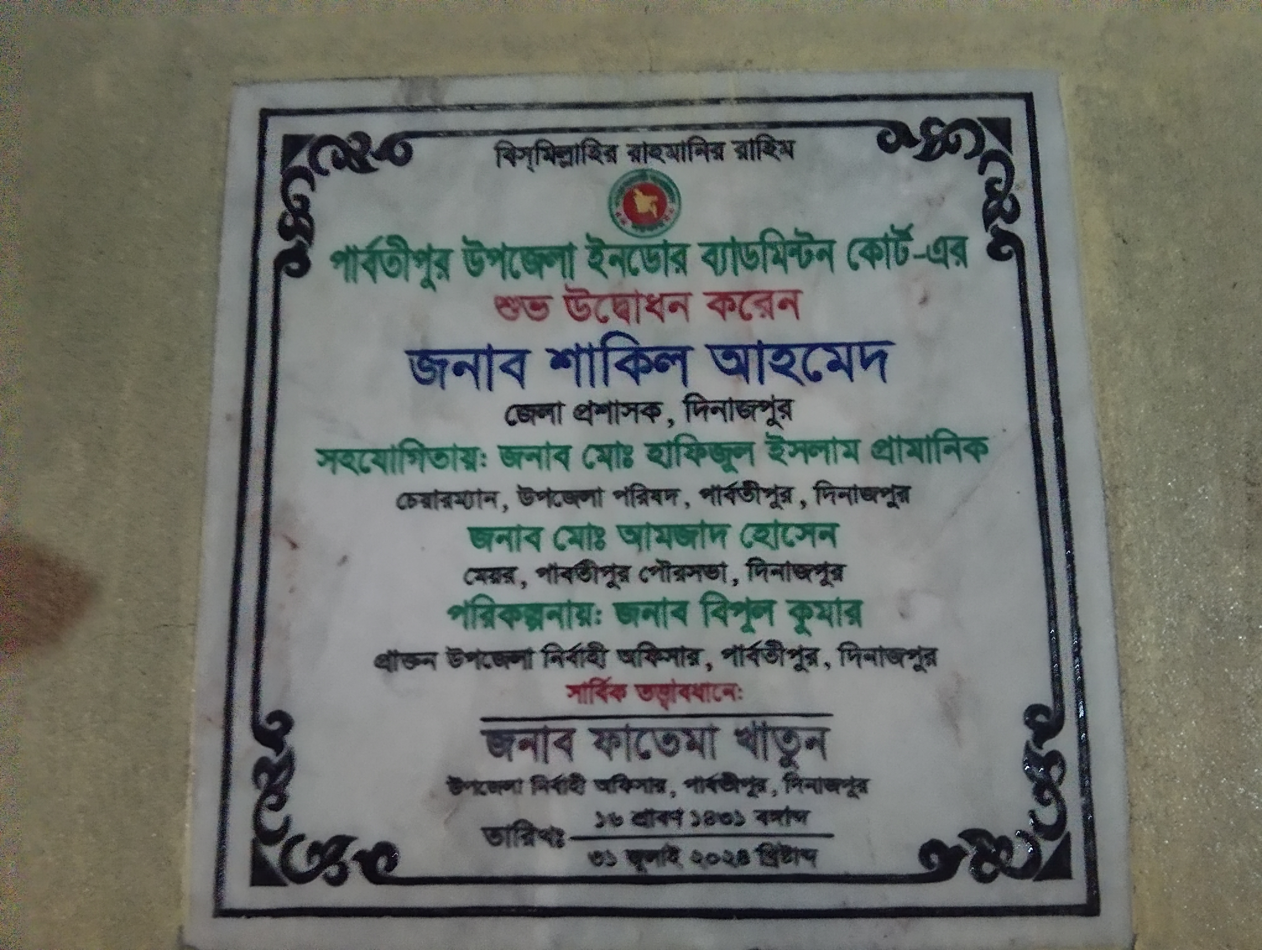 🏛️ Opening Plaque 1: Indoor Badminton Court – Parbatipur