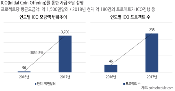 이러한 토큰 이코노미의 장점으로 최근에는 ICO를 통한 기업의 자금 조달이 늘어나고 있으며, 17년부터 모금액도 크게 늘고, ICO 프로젝트 수도 크게 늘었습니다.(그림2) 18년의 경우 4월초 기준으로 ICO 진행 프로젝트의 수가 180건에 달해 1사분기에만 벌써 17년도 진행 프로젝트의 77%를 진행하여 18년 전체를 기준으로 할 경우 그 수가 17년도의 3배에 달할 것으로 예상됩니다. 또한 17년의 경우 ICO를 통한 자금조달이 기존 Venture Capital이나 Crowd funding을 넘어서 이미 기업의 자금조달 수단으로 자리를 잡아가고 있습니다.