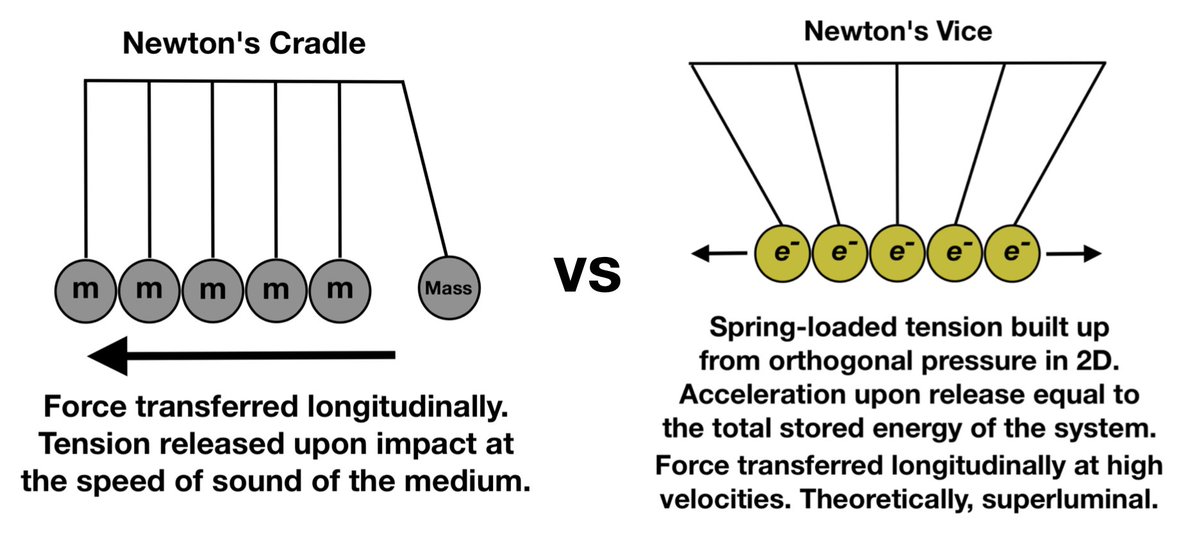 Now apply that to the subatomic scale in 2 dimensions with negatively charged electrons that want to repel from each other. They are forced together in a state of coherence. So much so that there can be no vibration or difference between the constituents in the spring loaded state. Add one electron or take an electron away… the entire spring loaded state feels it immediately. Like displacement sitting in a bathtub and the medium reacts on demand/simultaneously.