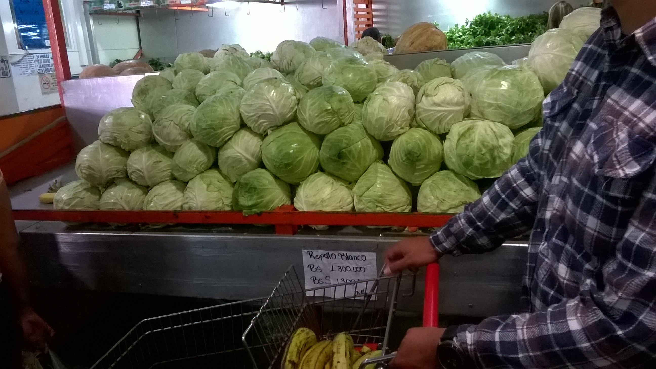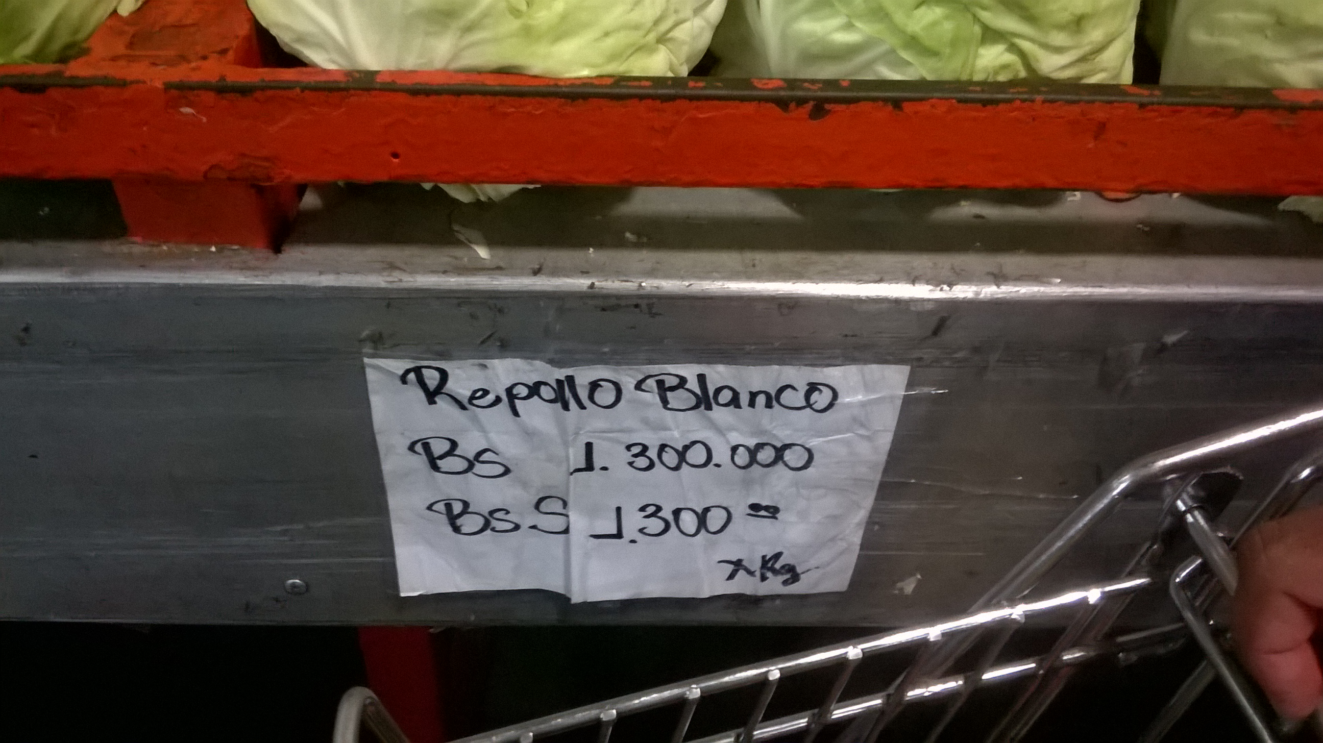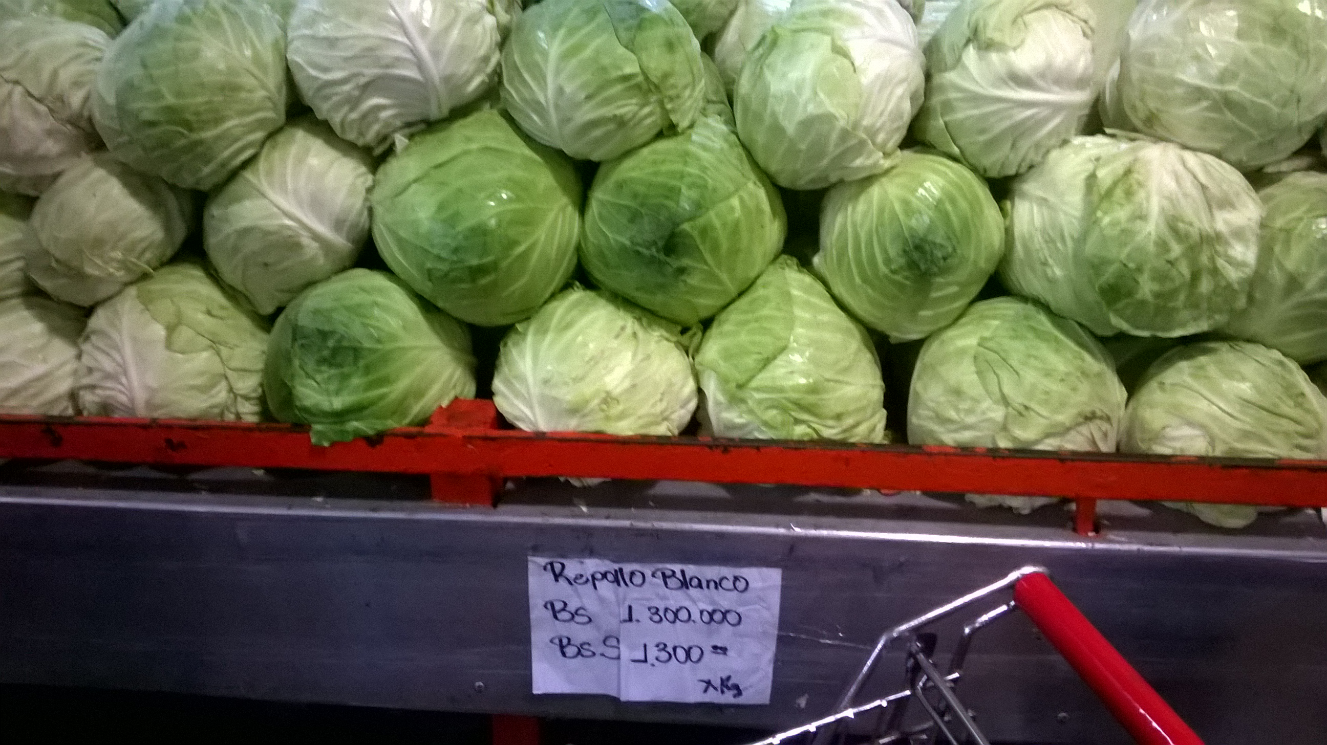 This is a “normal” market in Venezuela, actually, it is a community one. What it means is that it is cheaper than in anywhere else. This is what surprised me. As you can see in the pic, this is the section of cauliflower where it says in the paper that the price for one Kg of cauliflower is 1.300.000bsF. Now, you probably don’t understand how much it is and if it is cheap or expensive so now I am going to explain how much it is in dollars and how much is the minimum wave in Venezuela.