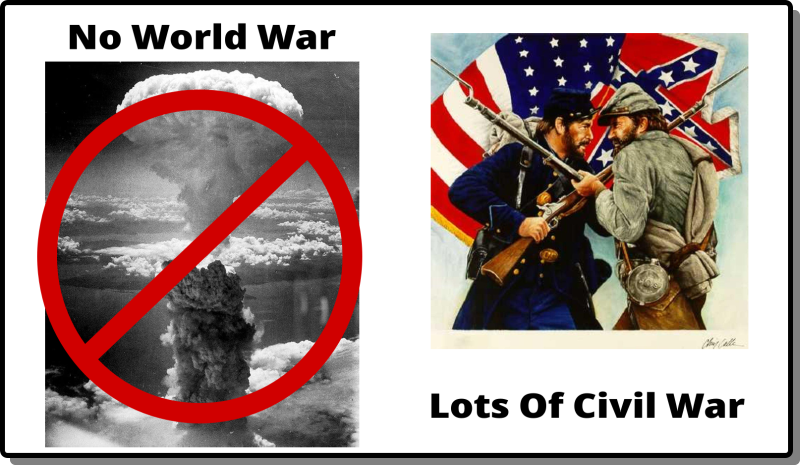 This is a weird question, because everyone has been programmed all their lives to think that WW III was inevitable. Humanity wars, thus, sooner or later, we would have one, last, great big war, that would likely wipe out humanity.