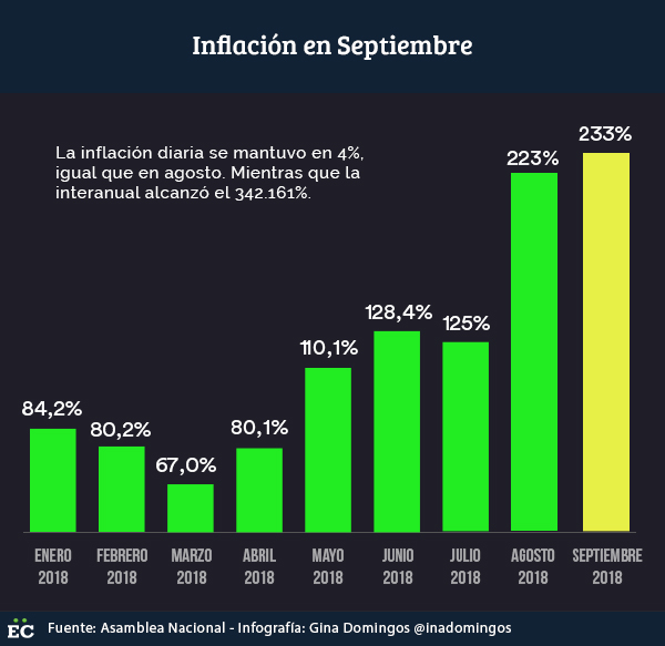 The inflation of September 2018 reached 233.3%, the highest index of the year registered by the Finance Committee of the National Assembly (AN). The deputy Juan Andrés Mejía reported that the daily average is 4% and the accumulated 82,043%.