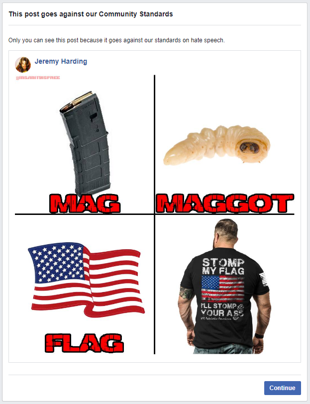 So not only is a shirt like this in direct opposition to freedom of speech, property, and malum in se law, and not only does it make American "patriots" look like dumb entitled, drooling, brainlet snowflakes, but it's also not legal, according to the laws the kind of "person" who would wear this shirt yips at the end of their leash to defend. That said, here is a screenshot of the offending image, along with the proof that Facebook accused me of "hate speech" for mocking it. Brace yourself - it must be pure evil.