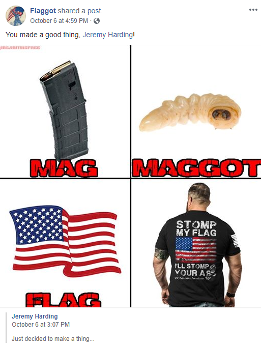 On October 6th, 2018 at 3:07 PM, I'd just finished an amusing image - a word association puzzle, if you will. It was a four panel image, and it was as follows. On the top two panels, it had a picture of a standard ammunition magazine, shortened to "mag", on the left, and a maggot on the right, with the word "maggot" under it. On the bottom two panels, there was a US flag on the left, with the word "flag" spelled out, and on the right, a picture of a dumb meathead, so incapable of rational discourse that he chose to wear a shirt threatening violence on flag desecrators. His shirt read "Stomp my flag - I'll stomp your ass", with a worn American flag on the back.