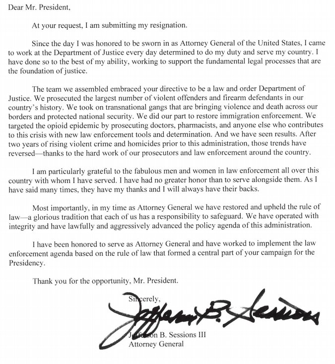 Former Attorney General, well known as Jeff Sessions, sent on Wednesday, Nov. 7th, a letter of resignation in which he pointed out how “we have restored and upheld the rule of law — a glorious tradition that each of us has a responsibility to safeguard.” You can read it here: