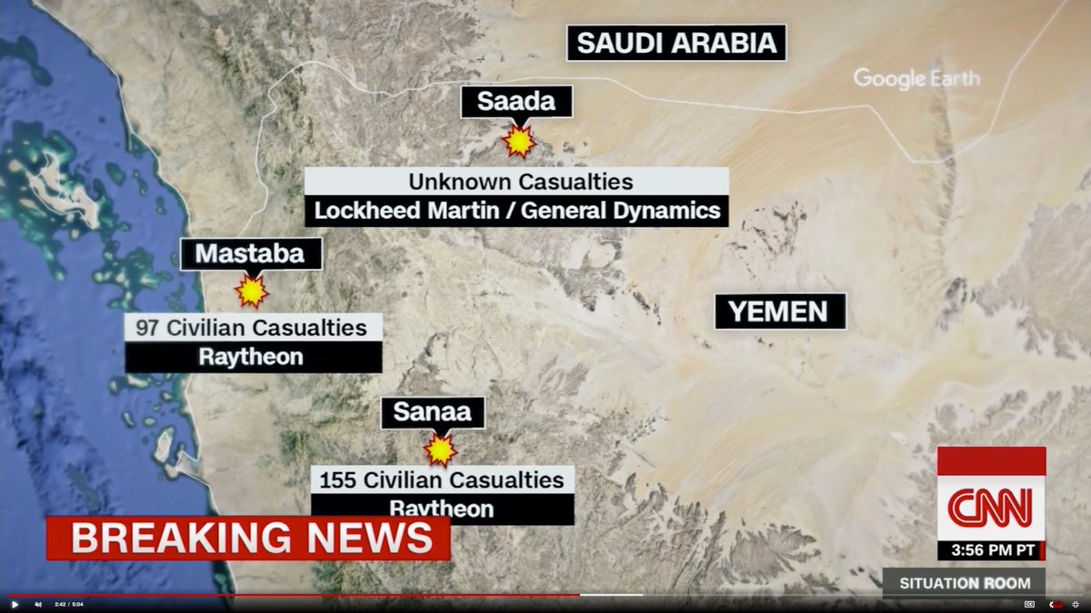 …directly accusing US military/industrial complex for help in repeated mass murders over enormous number of civilians. This time, at least 51 including 40 children, aged 6—11 on Thursday, August 9th in Saada, Yemen. How have they missed so large chunk of truthful reporting into their program? They never did touch Yemen, with the exception when Wolf Blitzer expressed deep concern that banning Saudi weapons sales and preventing genocide could hurt corporate profits:
