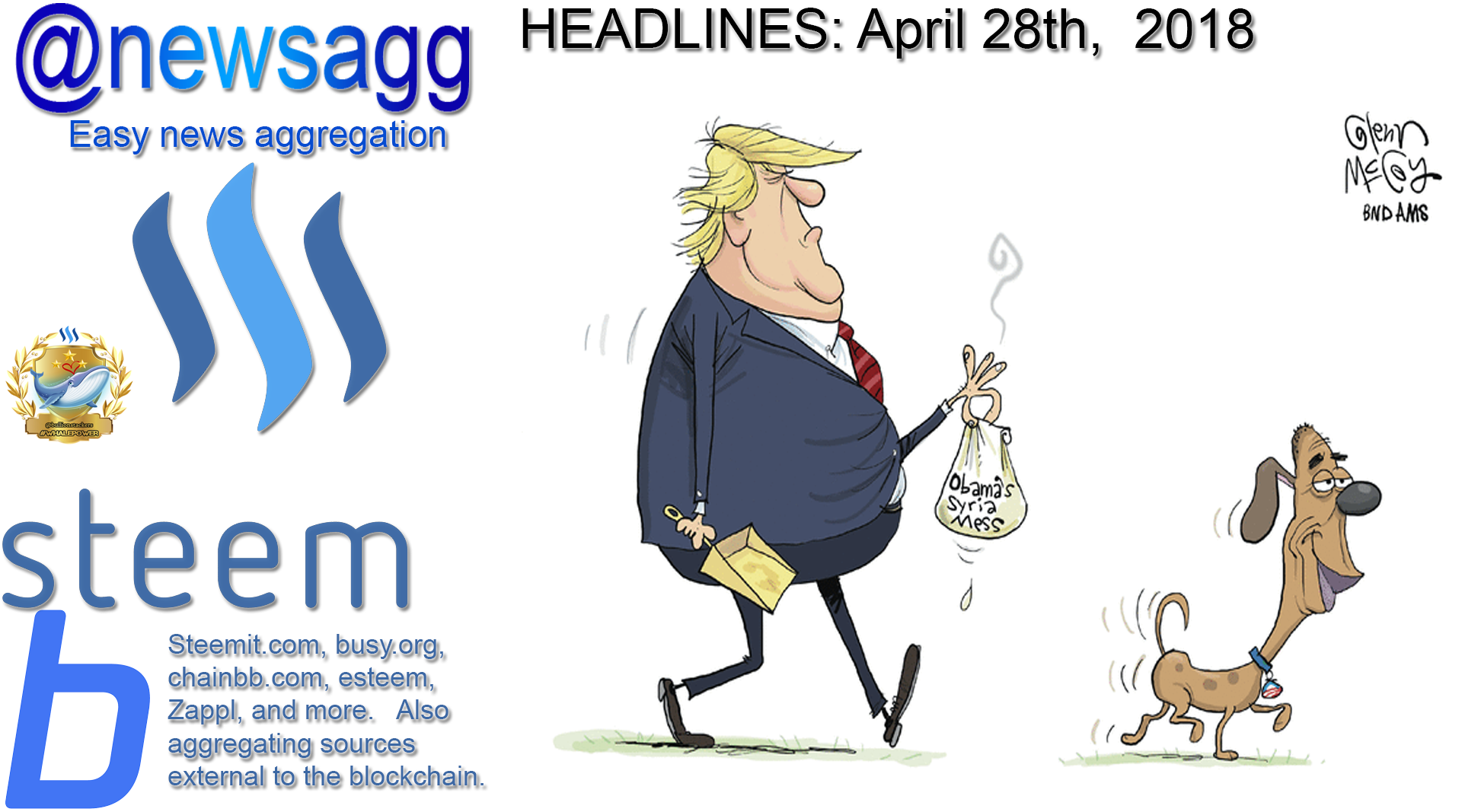 Thank you for reading @newsagg. This is a news aggregator service for steemit. It is constructed daily by hand and does take some time. Many of us practically live on steemit now. As such we can often forget to check what is going on out there outside of steemit. This account was created as an attempt to help mitigate that some. This is experimental so the account will likely go through transitions as it is determined what is most useful to the community. Feel free to submit news tips as comments. They will likely not be looked at extensively until the next aggregation post to which they are most suited. We will try to limit the amount of these posts that we post each day to no more than 4, unless some breaking news warrants there should be more. With this account we will not do a lot of comment and reply unless it is necessary to verify or get further information on a tip. Those of us that work this account will use our personal accounts for interactions of a personal or opinion nature. We wish to remain free of bias and simply present the news on this account.