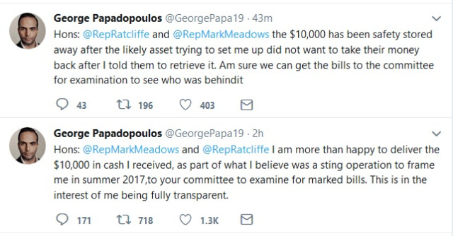 However, it looks like one of Mueller's more recent dirty tricks just might backfire on him- in the person of George Papadopoulos. It all has to do with a purported bribe of $10,000 given to Papadopoulos by a shady character names Charles Tawil at a meeting in an Israeli hotel room. Tawil, as it turns out, happens to be a CIA/FBI asset. In a tweet to Rep. Mark Meadows and Rep. Ratcliffe he states...