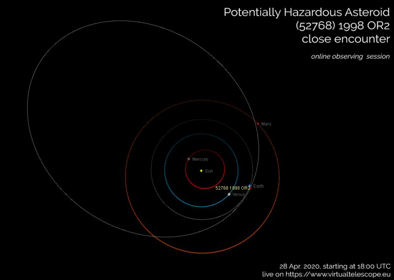 The Virtual Telescope Project will present an online viewing of Potentially Hazardous Asteroid (52768) 1998 OR2 on April 28, 2020. As the time approaches, check this page for more details.