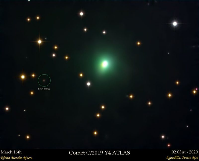 Astronomers using the ATLAS (Asteroid Terrestrial-impact Last Alert System) in Hawaii discovered Comet C/2019 Y4 (ATLAS) on December 28, 2019. As of mid-late March, it shines at about the brightness of an eighth-magnitude star – not visible to the eye yet – but within reach of medium-sized telescopes in dark skies.