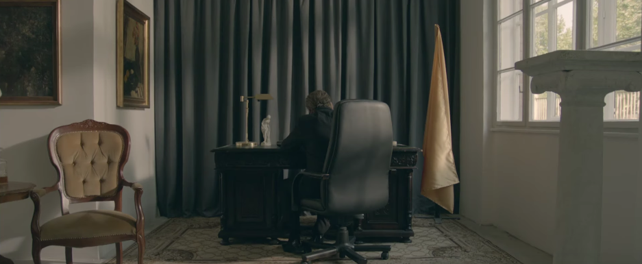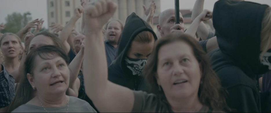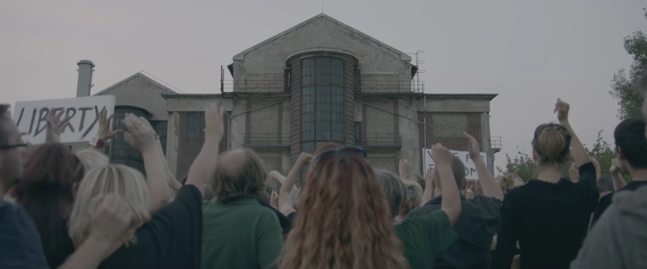 After that, you can see the yet living politican in his house, while a huge crowd is protesting in front of his house. One of the people in the crowd is showing a sign with "Liberty" on it: