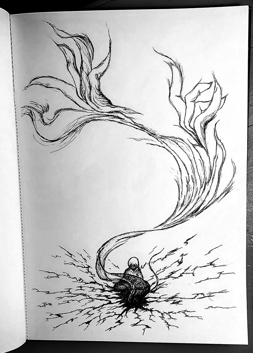 The little human being sat in awe of the ever-expanding crack in the earth, staring mesmerized at the wisp that flowed out of it, full of complex images that appeared and disappeared like an ever-changing cloud.