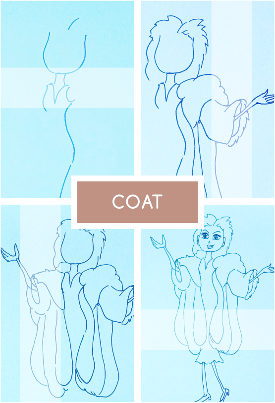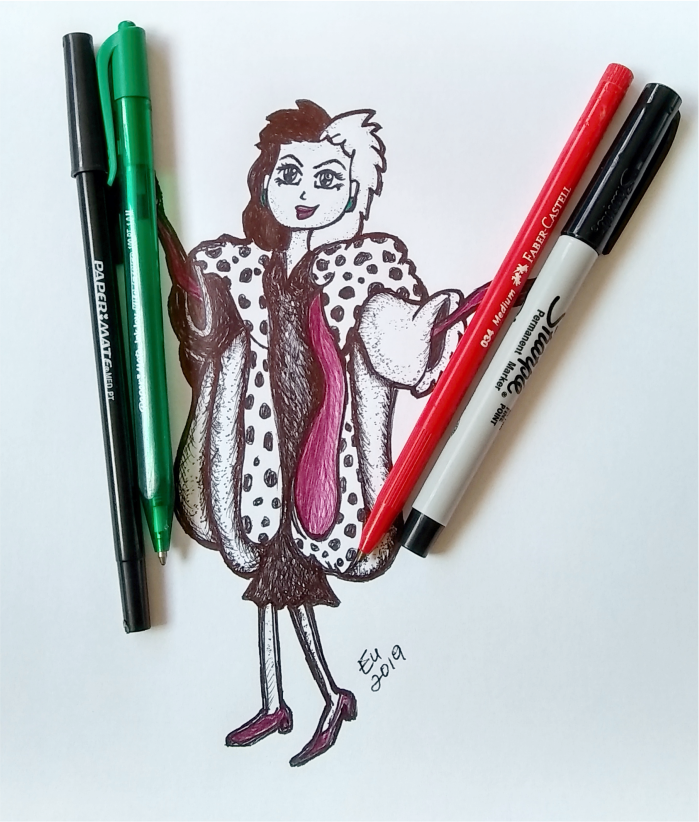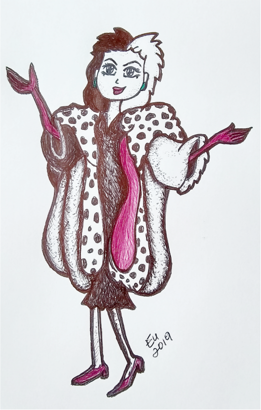 Sigo dando saltos y llego al día 27 de Octubre, la palabra es Coat (Abrigo/Capa,entre otras), para esta palabra pensé en Cruella De Vil pues ella sí que ama estar vestida de sacos especialmente hecho de pieles de animales, en este caso la dibujé en uno de sus sueños donde se mira a sí misma vistiendo una saco de piel de dálmatas, sabemos que nunca logrará ese sueño...¡no se lo vamos a permitir!