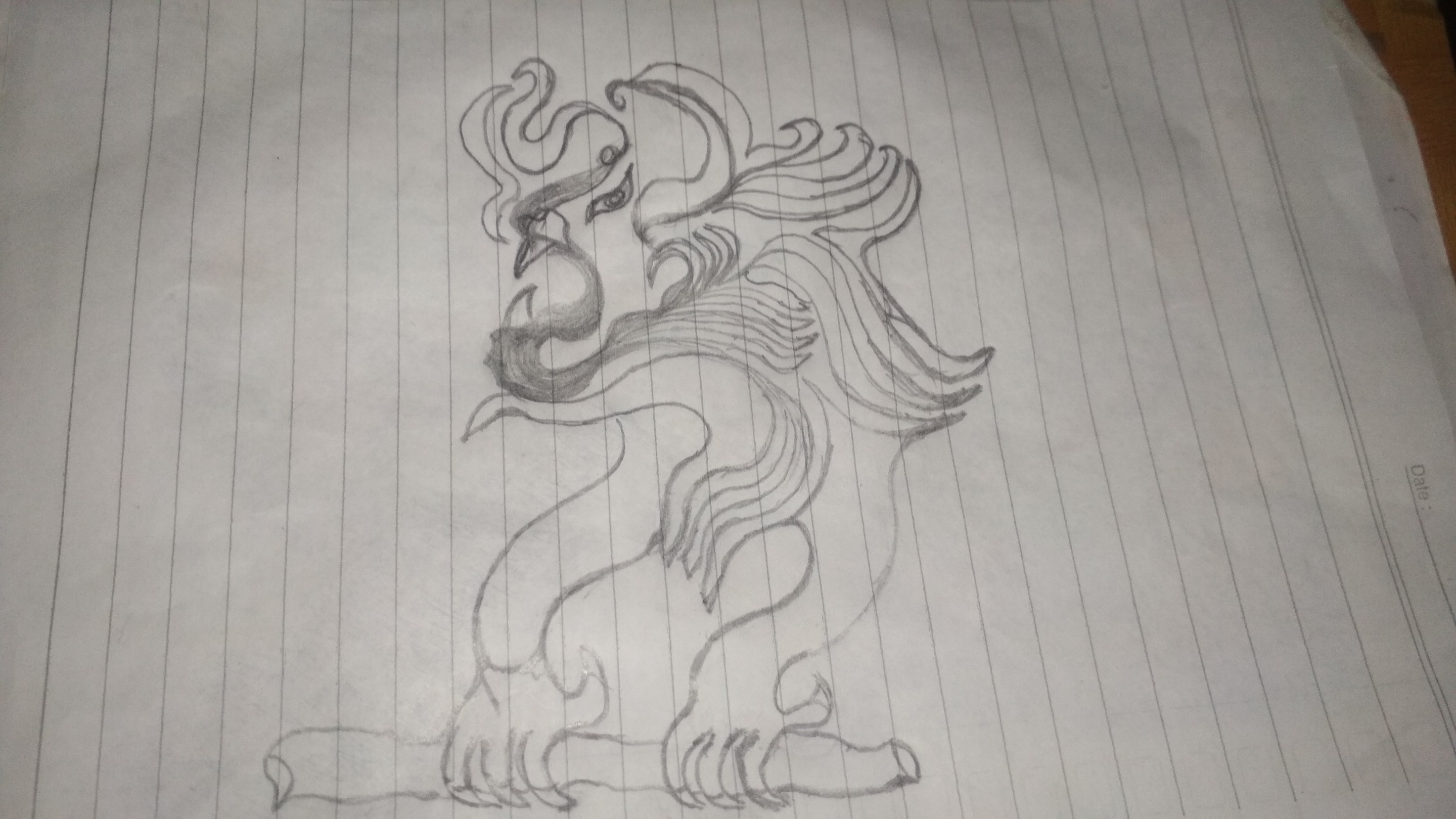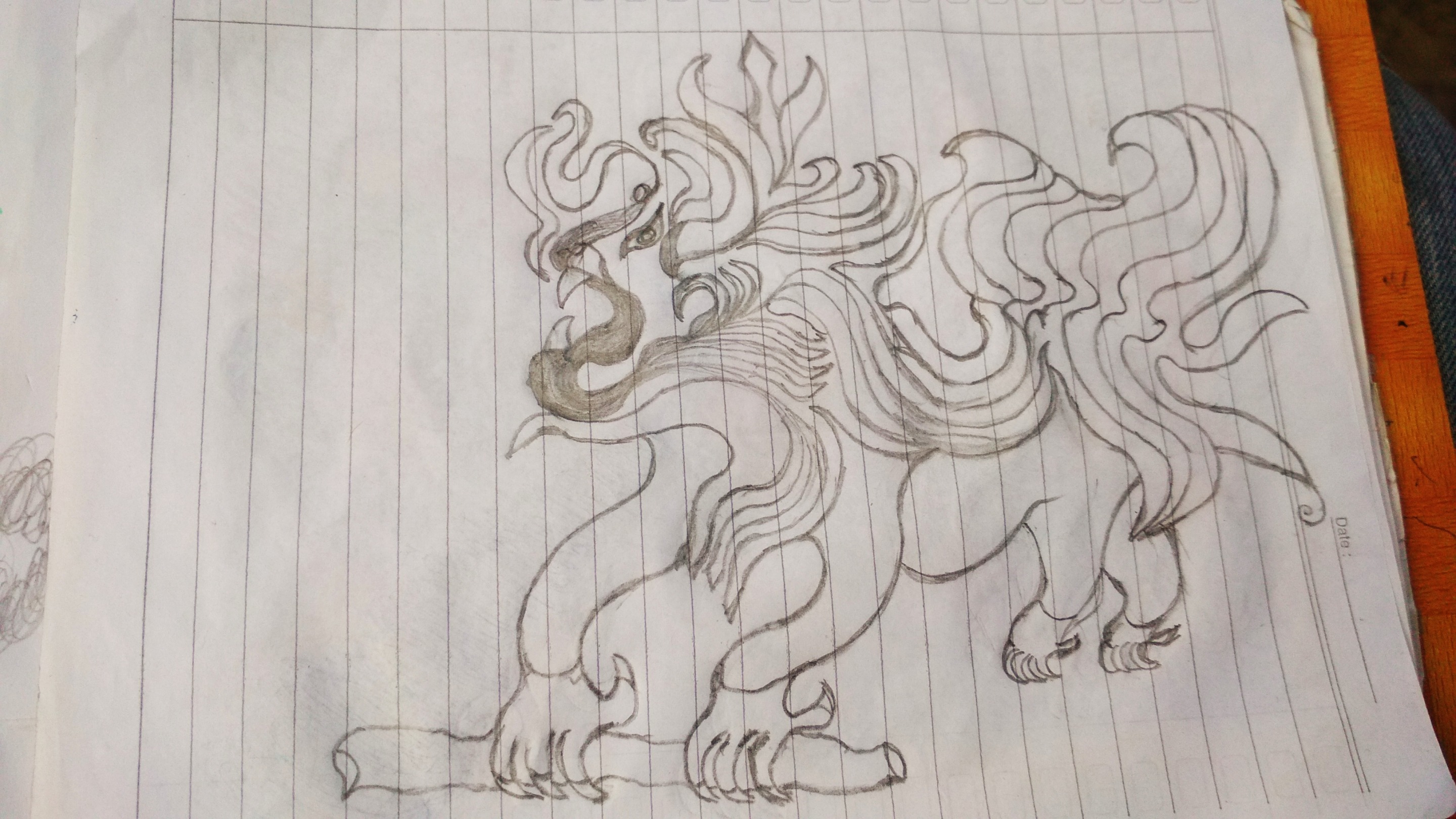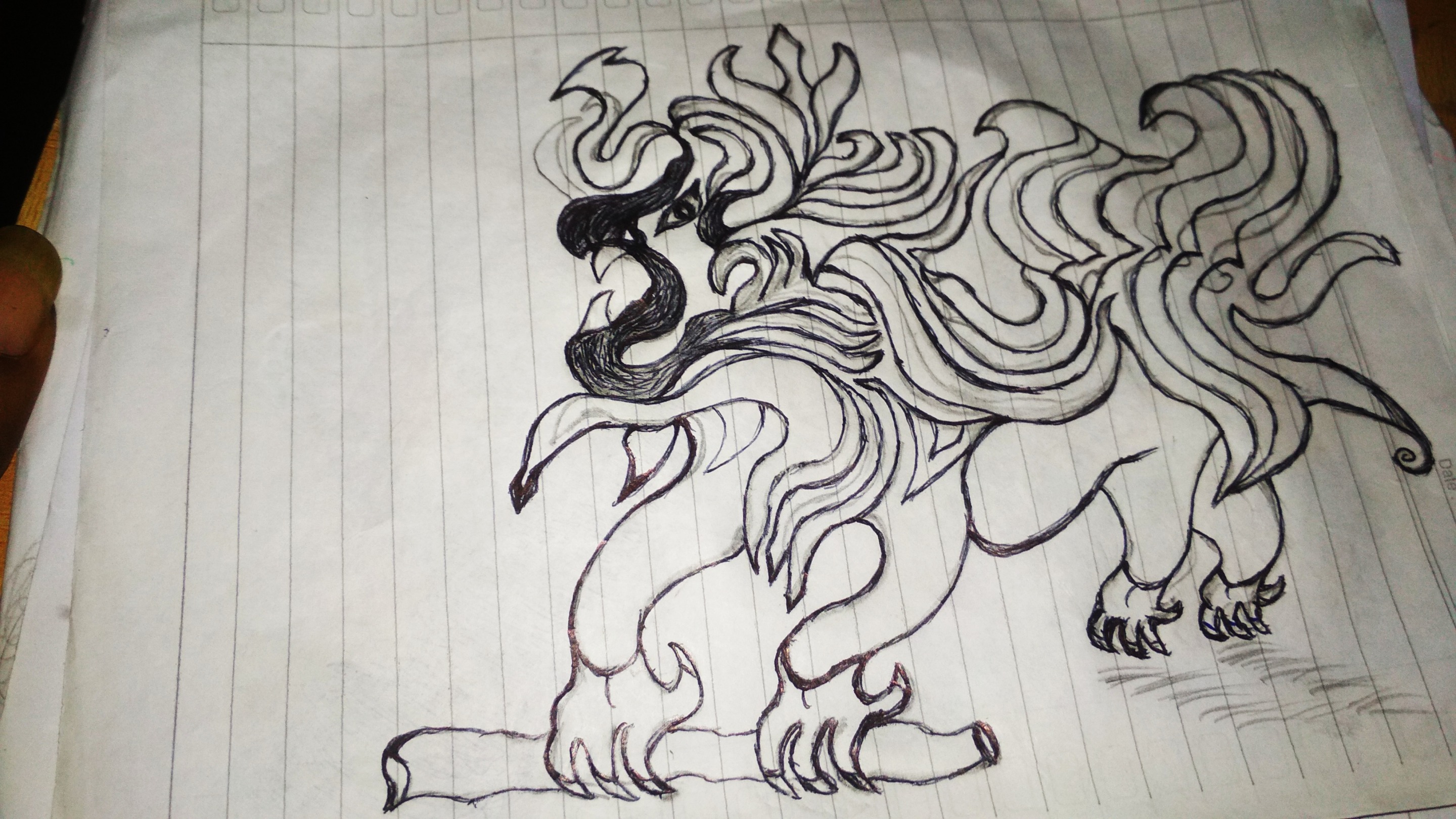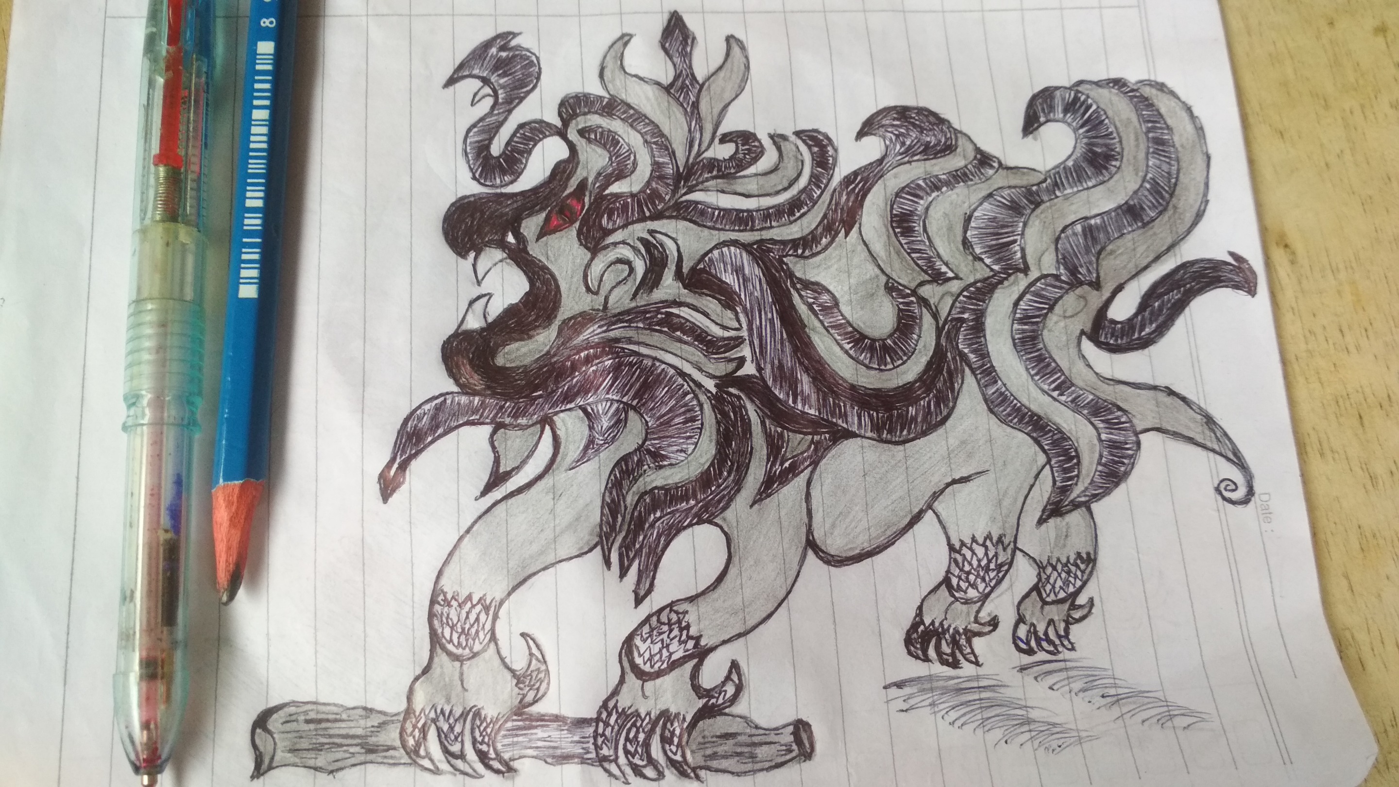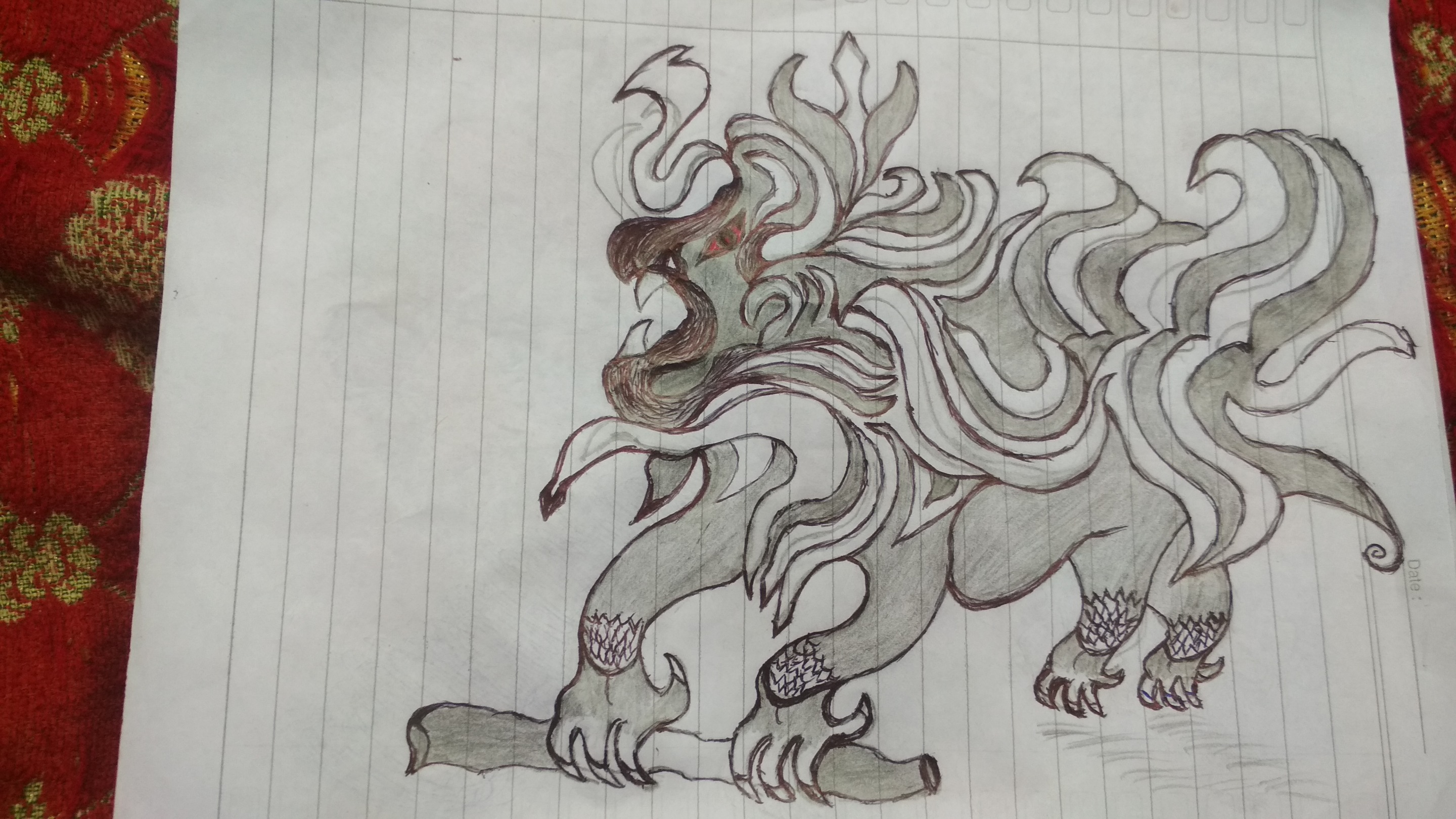At first I never thought that what I was describing would resemble tiger-shaped monsters. I continue to do it with ink engravings that look unique. after everything was finished then I etched the tip of the pencil and black ink and a little red ink. I only did this to give each room a monster picture of color. this time I really did it only with a pen and pencil on a piece of notebook paper.