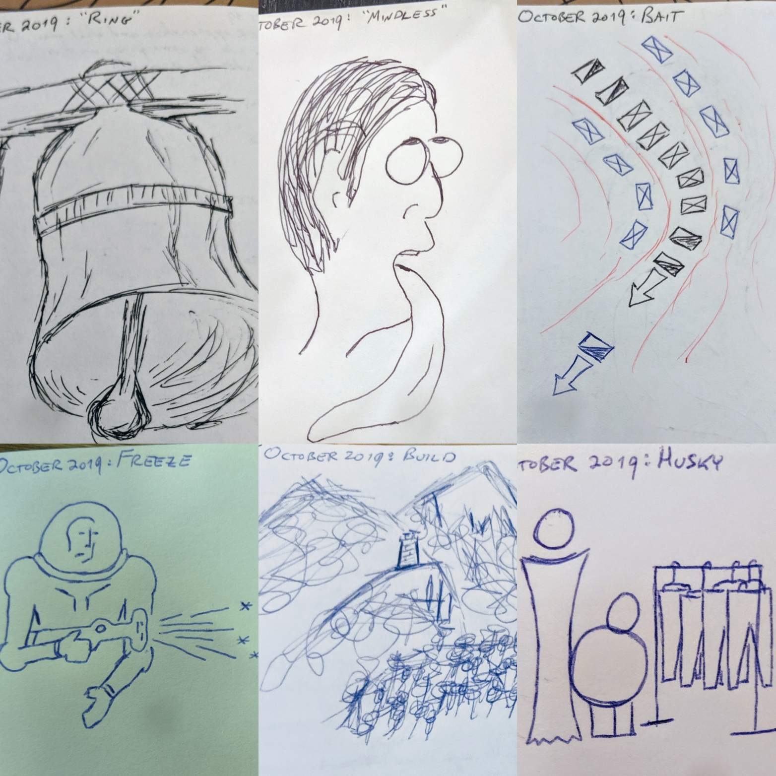 Preface: I'm doodling my little doodles. In addition to this, I'm trying to write short stories when inspiration strikes. The Inktober sketch for this story appears at the top and there's a collage of the first six days' work at the bottom.