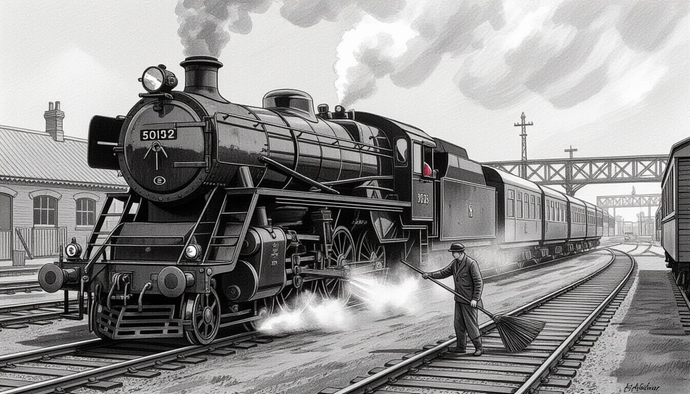 For today's image I thought I would generate an image of a conductor sweeping dust next to a steam locomotive. Such an image segues into a discussion of the problem of STEEM dust.