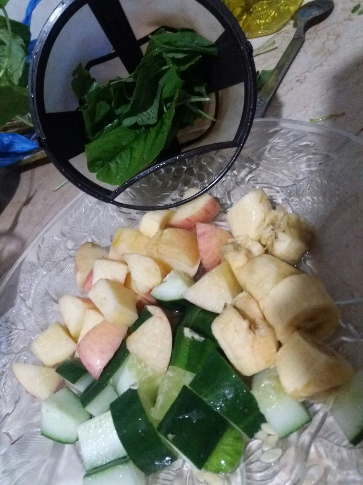 Put all the ingredients and blend well to make your cucumber, banana apple spinach juice.
