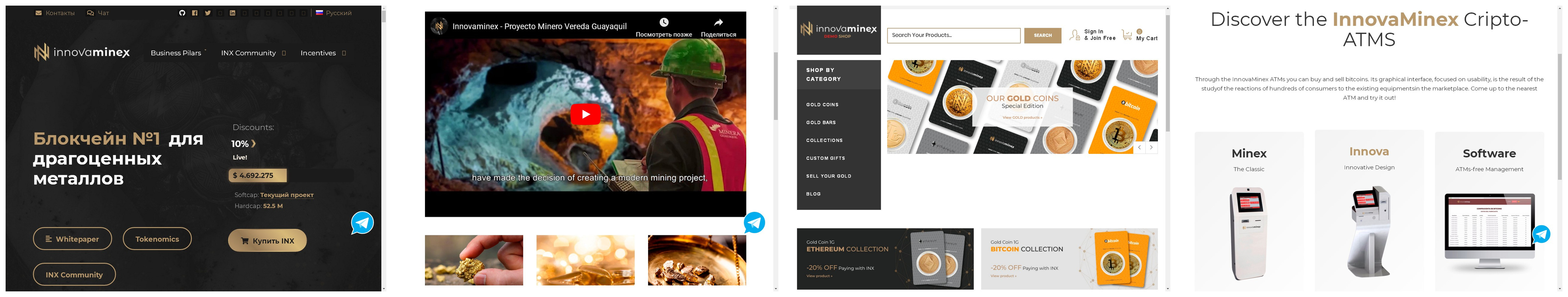 - Собственные банкоматы компании InnovaMinex , при помощи которых будет происходить покупка и продажа криптографической валюты INX, BTC, ETH и других криптовалют. Кроме того, через банкоматы можно будет осуществлять покупку изделий из драгоценных материалов.