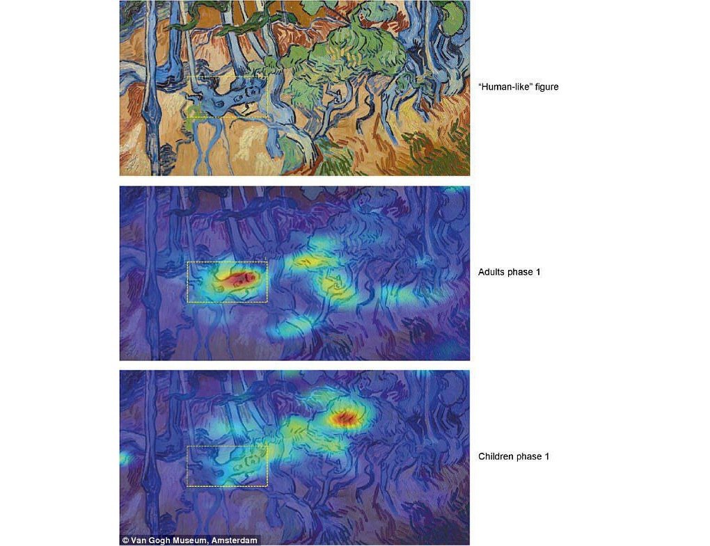 Adults in both stages of the test prevailed descending strategy of perception. In this case, the brain uses not only notable visual stimuli, but also other sources of information - for example, the plot of the picture or the available knowledge about the artist's work. Interestingly, most adults (10 of 12) noticed an image of a naked human figure in the painting "Roots of the Trees," although the picture did not tell us about it. Of the children, only two saw her.