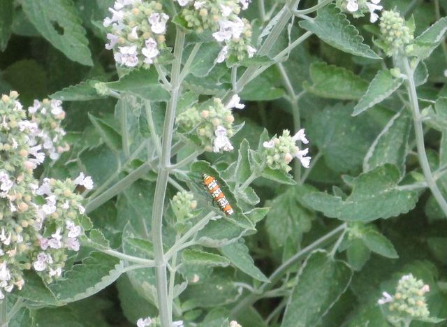 Their orange and black colors of the adults tell their predators that they are toxic and don't taste good. These moths can be found during the day sipping nectar from a variety of flowers and are good pollinators. I found this one on the catmint plant. They are also attracted to lights at night.