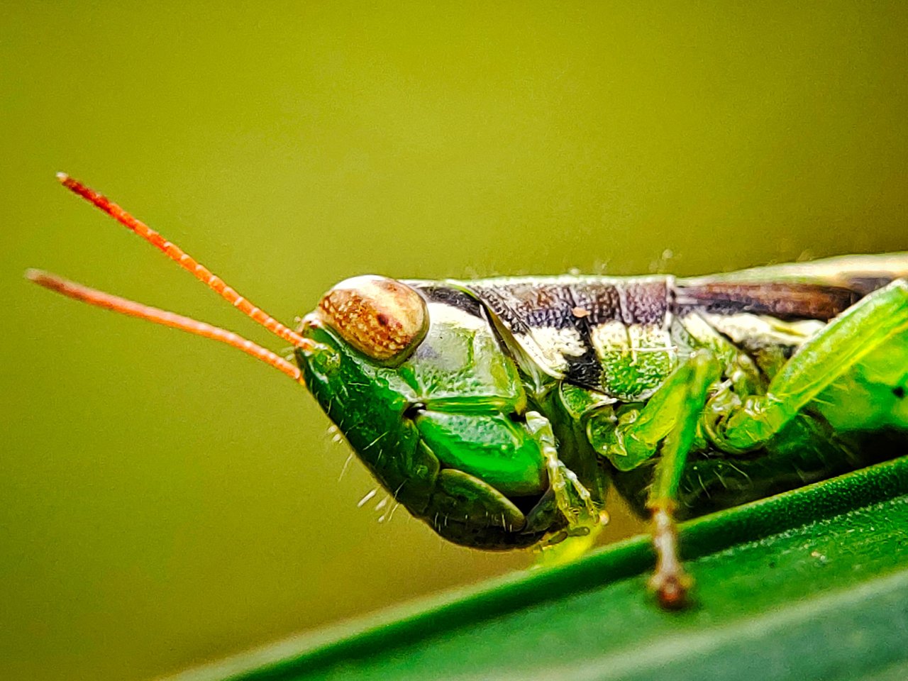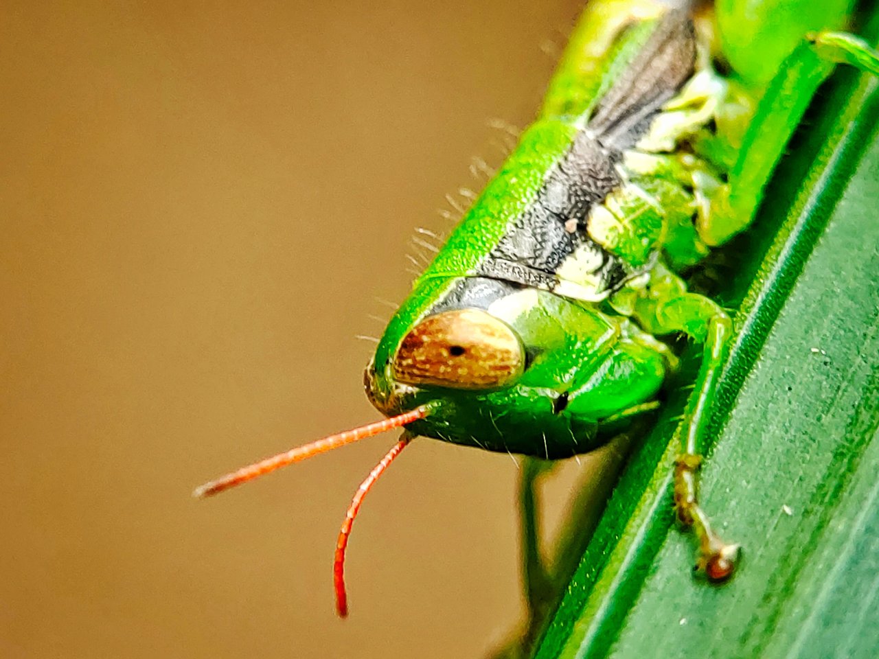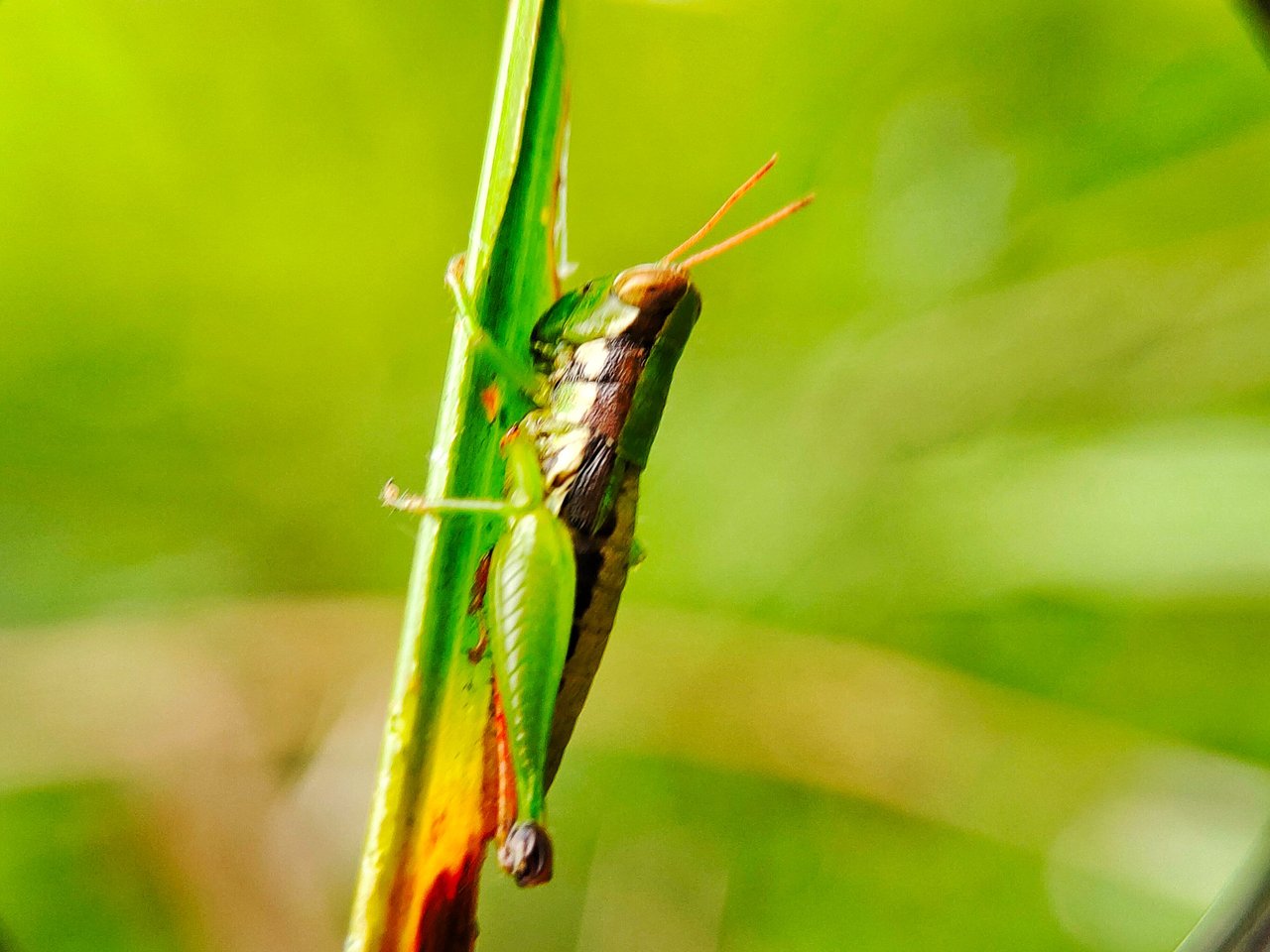And very carefully I immediately approached it very carefully so that this grasshopper species would not fly in another direction. And at that time I immediately took my smartphone camera and macro lens in my small bag, and at that time I immediately took several shots of the picture that looked very beautiful and interesting, and at that time I took several angles from the direction of its head to see the interesting side of this grasshopper species, and you can see it below.
