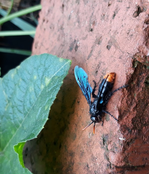Pyrrhoscolia fax is a wasp that parasitizes beetle larvae. I've often seen them digging and wondering what they were up to. Seems they were hunting grubs to sting, paralyse and lay their eggs in. I'm happy if they hunt in the vegetable garden, they keep the grubs from gnawing the roots.