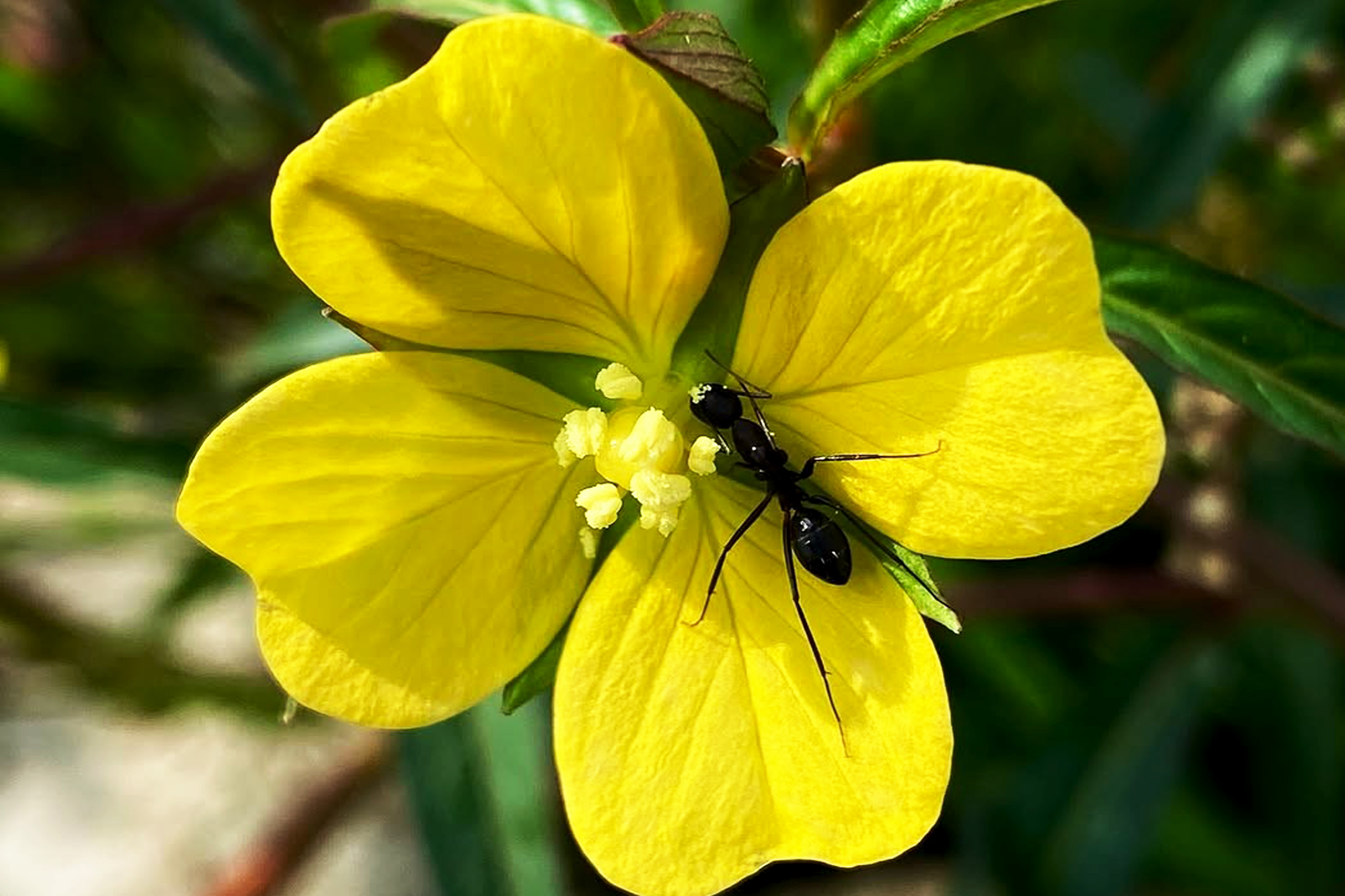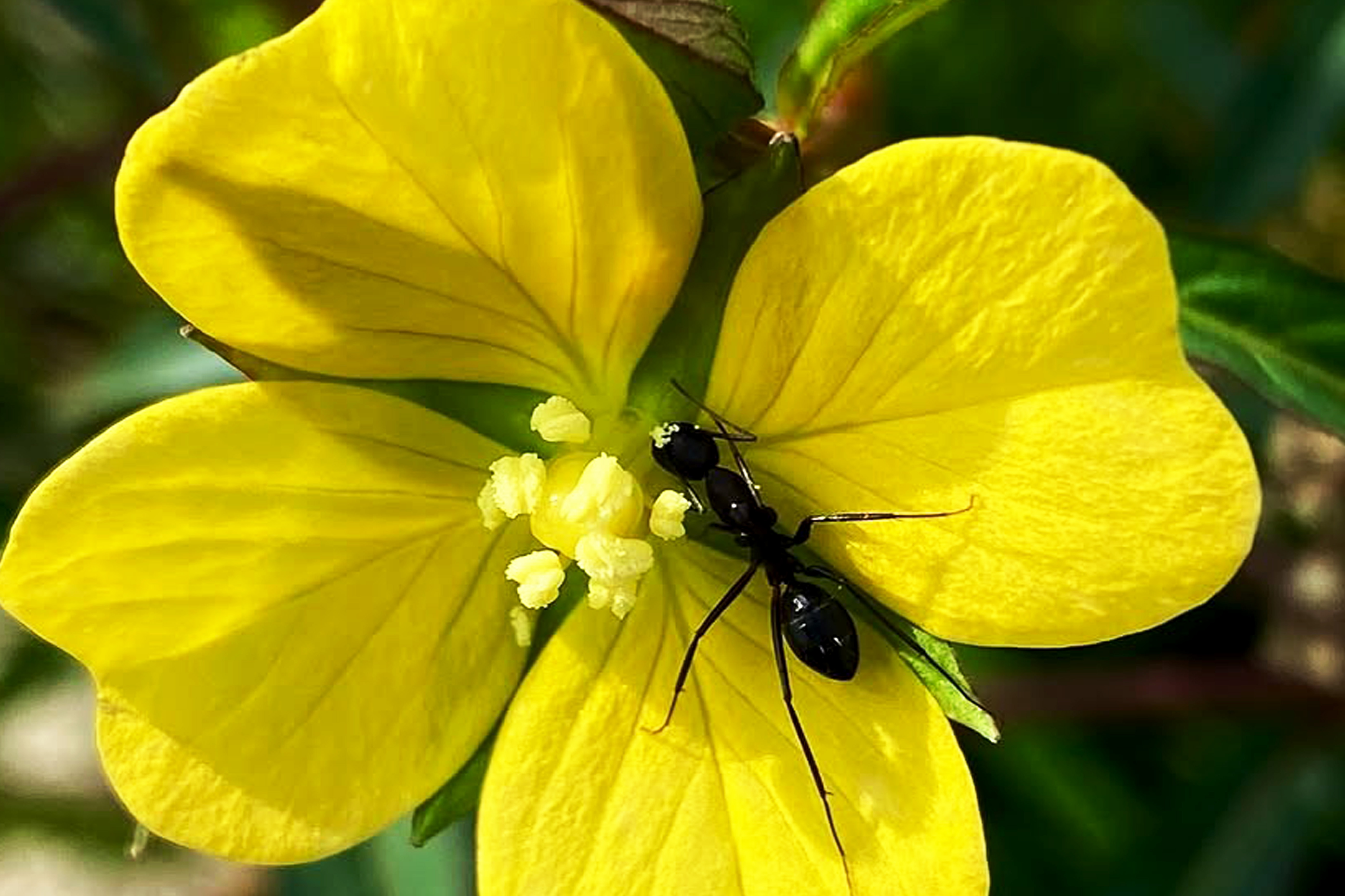 Black ants are hard workers from the micro world who live their lives with extraordinary diligence and discipline. They are not just mere inhabitants, but also important players in the ecosystem where they live. Yellow flowers, with their unmatched softness, offer valuable resources to black ants