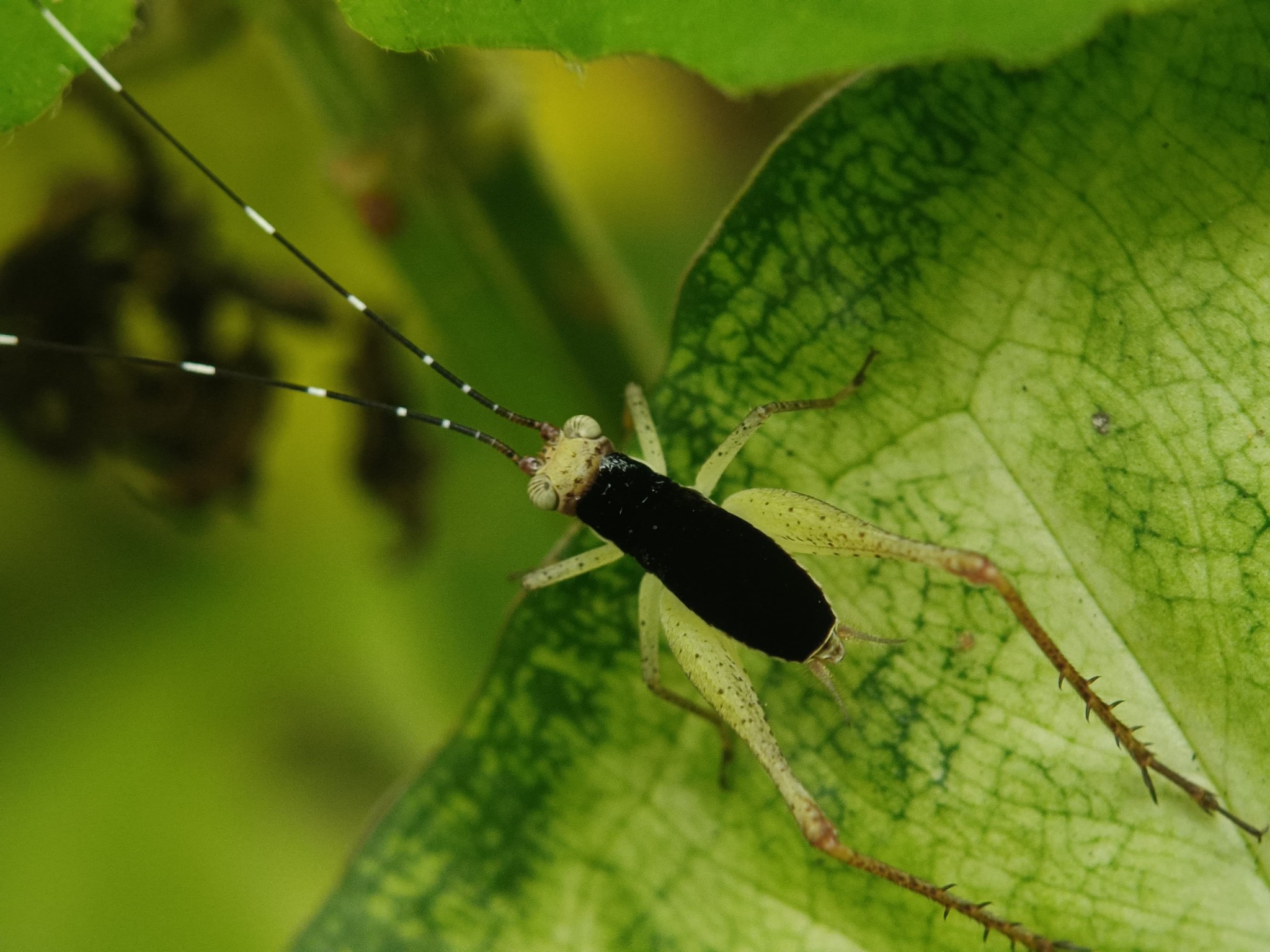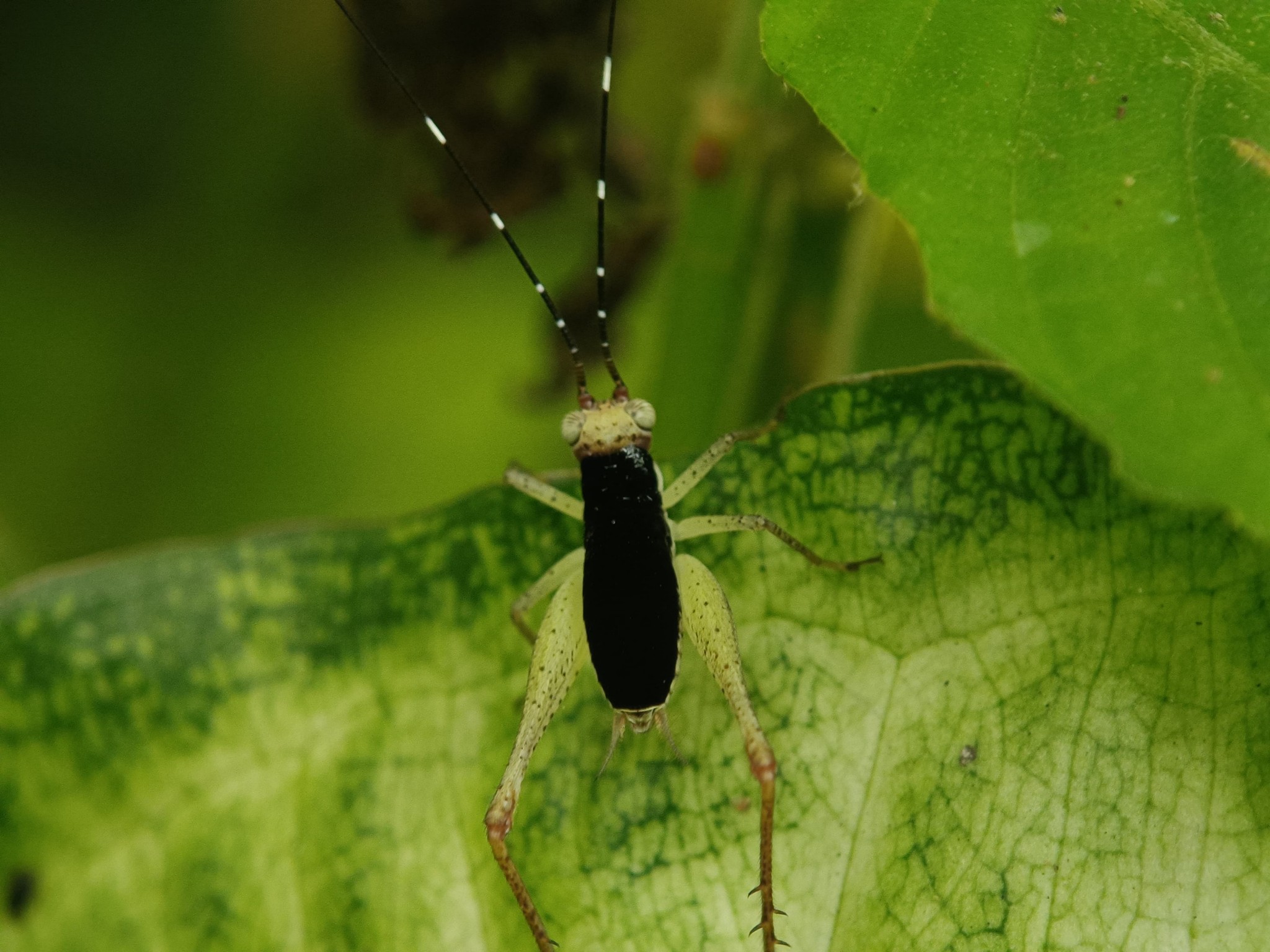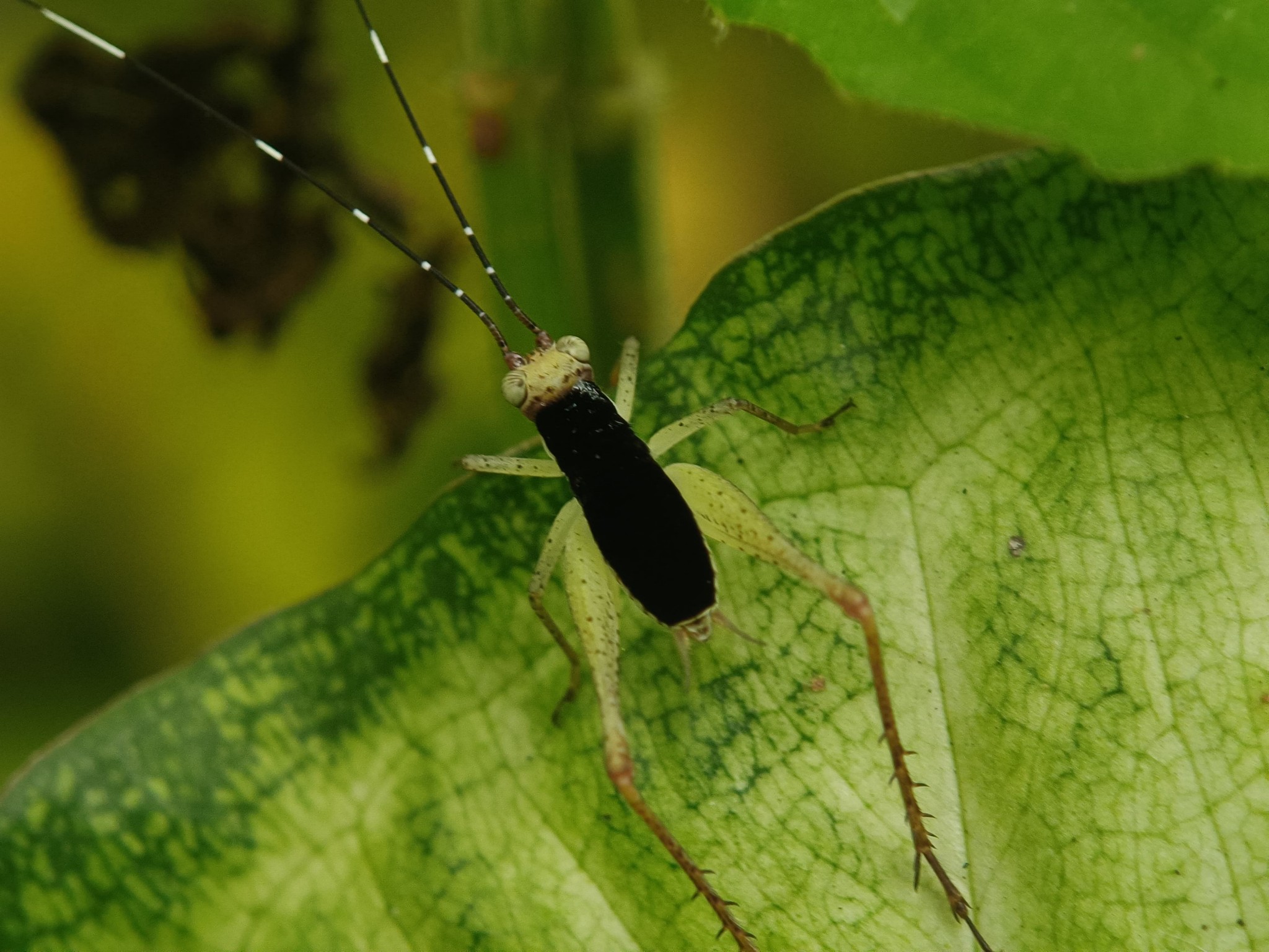 I don't know the name of this insect in other areas, but in my area this insect is often called the leaf cricket. This cricket has a very unique shape, which is oval and thin and has two large legs that are often used for jumping. Now look at the head, this cricket has a very long antenna that even exceeds the length of its body, but what is more interesting about this cricket is its very elegant color, this cricket has a black color on its back, and there is a green color on the legs and head, of course this is a very beautiful color combination. I myself managed to find this cricket in my chocolate garden, but it is very difficult to find it because this cricket has a color that is very similar to the surrounding leaves, and this cricket is also very good at hiding.